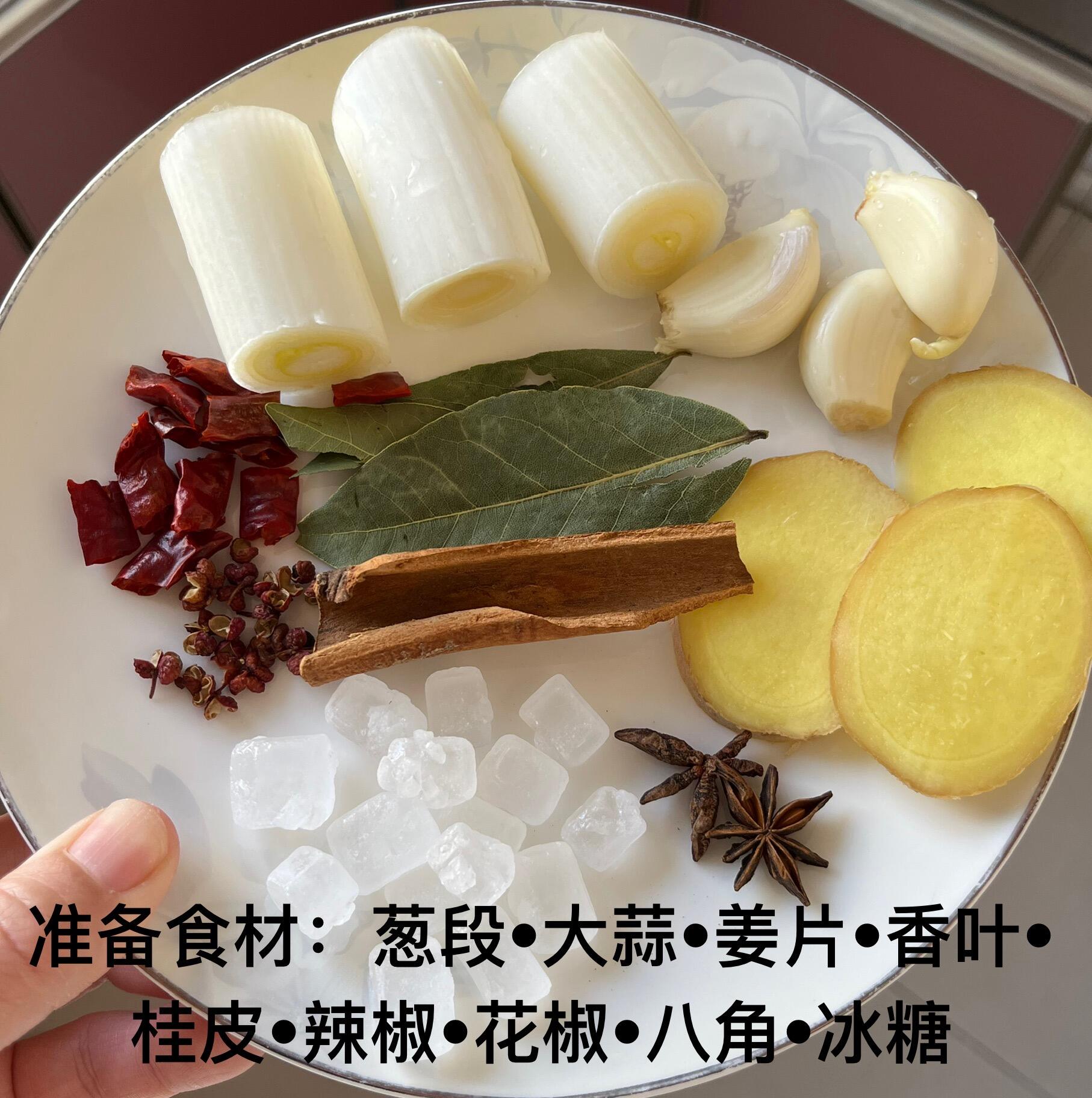 辅料:葱段、大蒜、姜片、香叶、桂皮、辣椒、花椒、八角、冰糖