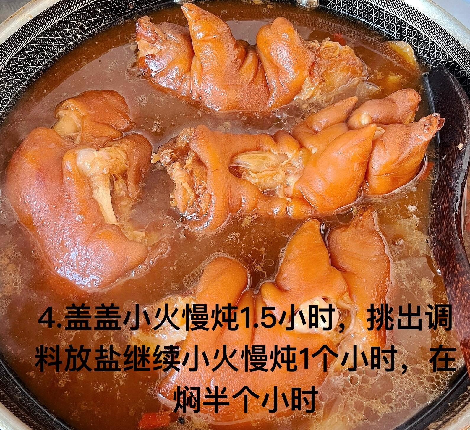 关键提示:炖制途中如果水变少,一定要加热水,尽量一次性加足水;盐可以多放些,尝一下汤汁略咸,这样卤出来的猪蹄才够入味,越啃越香!