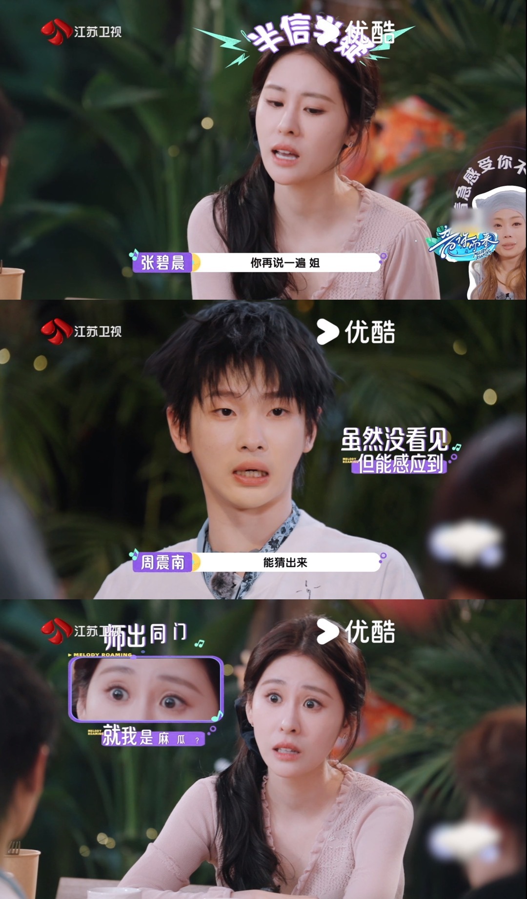 张碧晨被做局了 魔术环节所有人都知道怎么回事,就张碧晨一个人还蒙在鼓里。她一脸认真地问“这要怎么感受”,旁边的人都在憋笑,她还在等答案。这种后知后觉的迟钝感,确实有点可爱。音你而来