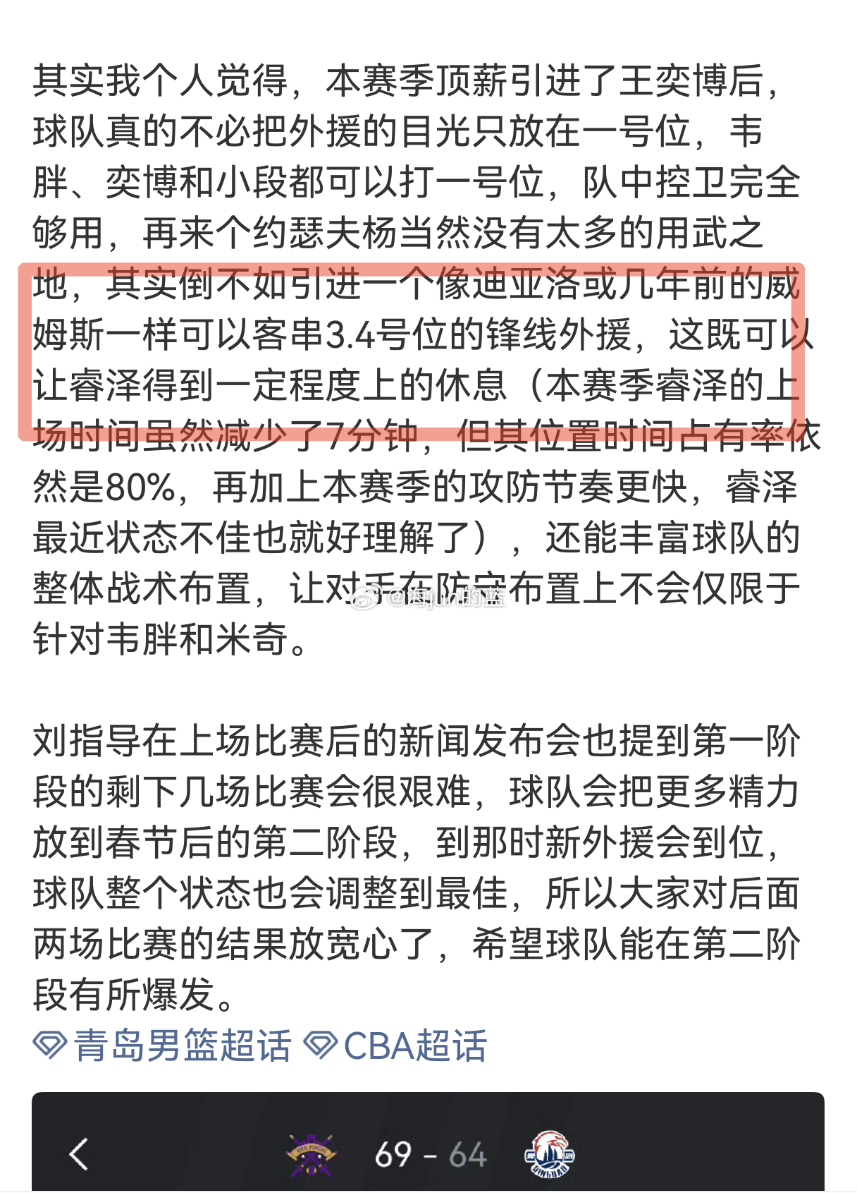 下一场,青岛将回到国信再次迎战北京首钢,而新外援也会在主场球迷的欢呼中迎来首秀,两个月前我曾提议球队可以考虑招募一个锋线外援,如今这个愿望也算实现,如此一来球队的战术变化会更加丰富,而睿泽也将有更多的休息时间,让自己在上场的状态保持的更好,让我们一起期待新外援给球队带来的活力和变化。CBA 青岛男篮