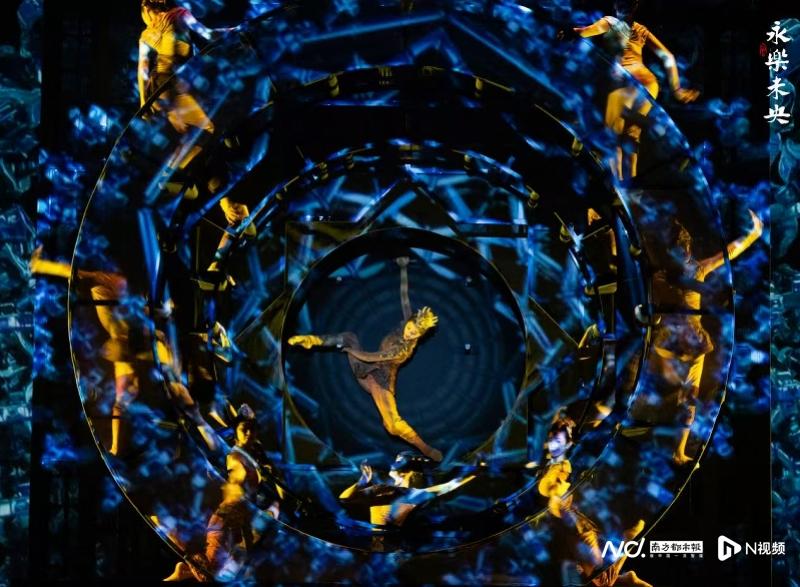 舞剧的多个选段堪称“文物起舞”的典范:舞蹈《璇玑万象》的创作灵感源于永乐宫三清殿穹顶的藻井结构。十二名女舞者于三层立面“斗八藻井”装置中,以刚柔相济的肢体动作,建构出藻井的繁复纹样,彩绘团龙在底层中央盘曲灵动,配合影像勾勒出“动态”藻井缓缓旋转,融汇成一场装置艺术、肢体语言与数字影像交织的视觉诗篇。“这段编舞不仅展现了古建筑的恢宏气势,也巧妙呼应了‘天圆地方’的东方哲学。”总编导谢元臻介绍。