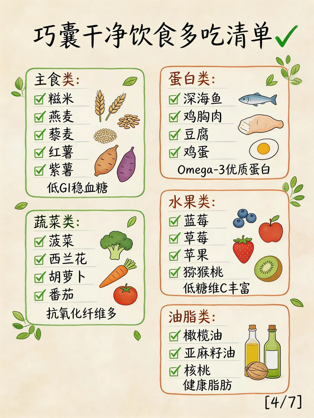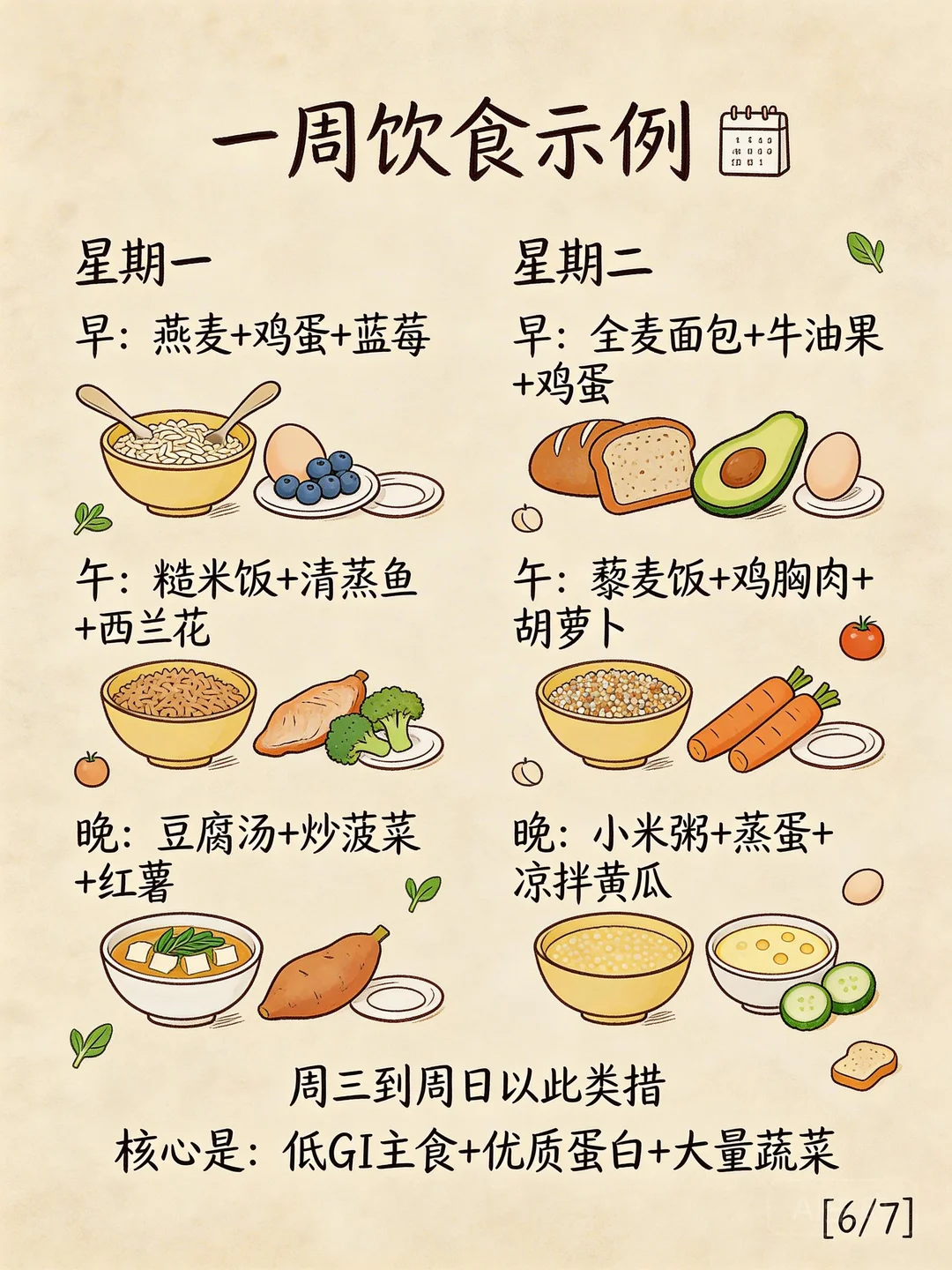 4️⃣ 优质蛋白每餐要有(鱼、蛋、豆腐、鸡胸肉)