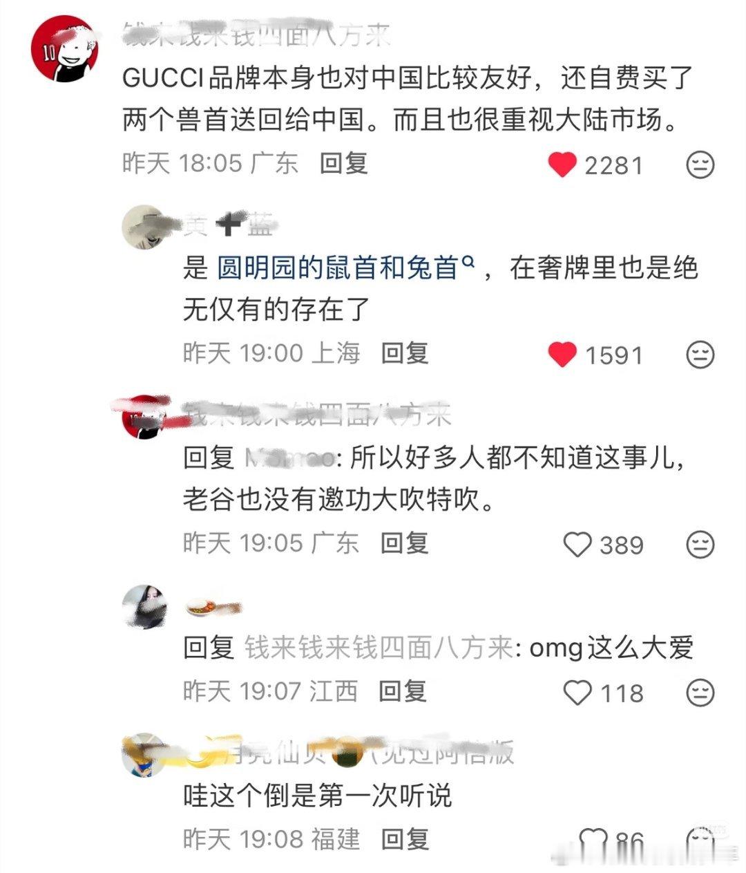 人家明明是说要更好的对待中国市场❗ 开云集团在2013年Gucci老板竟然自费买下圆明园兽首送回中国无偿捐赠给我们,这在奢牌里是绝无仅有的存在了吧,好感度拉满gucci不能再把中国市场当垃圾桶