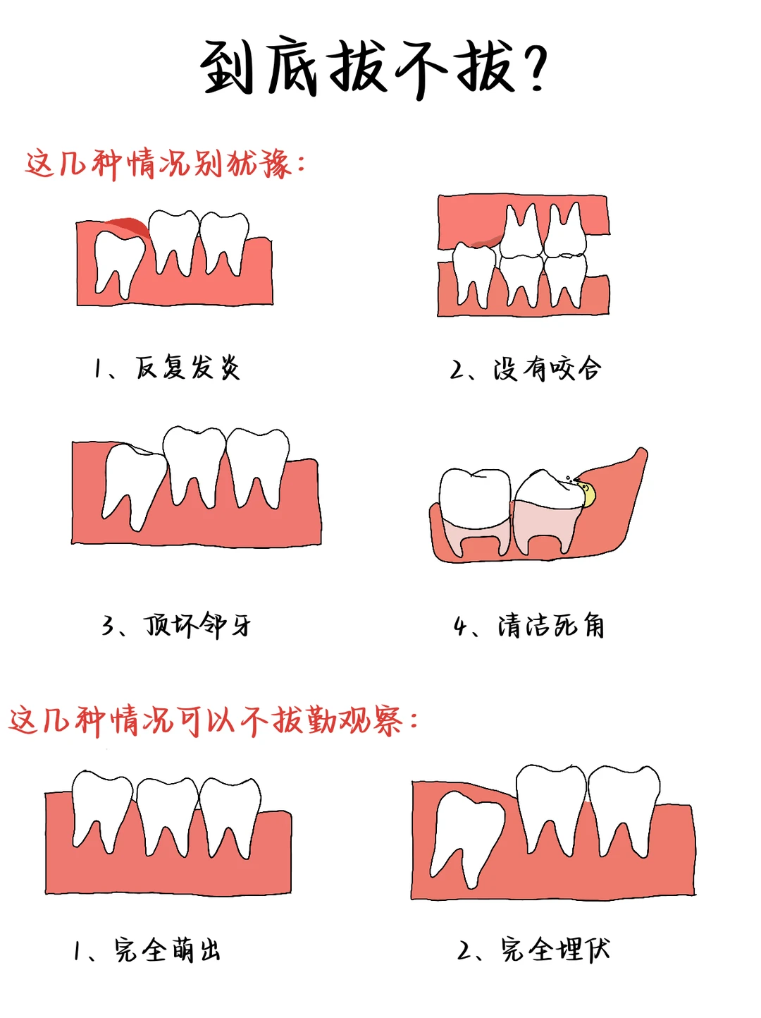 智齿有很多种生长位,具体拔不拔还是要看实际的生长情况。包括是否经常发炎,有没有顶坏隔壁的牙齿等,具体看p3。