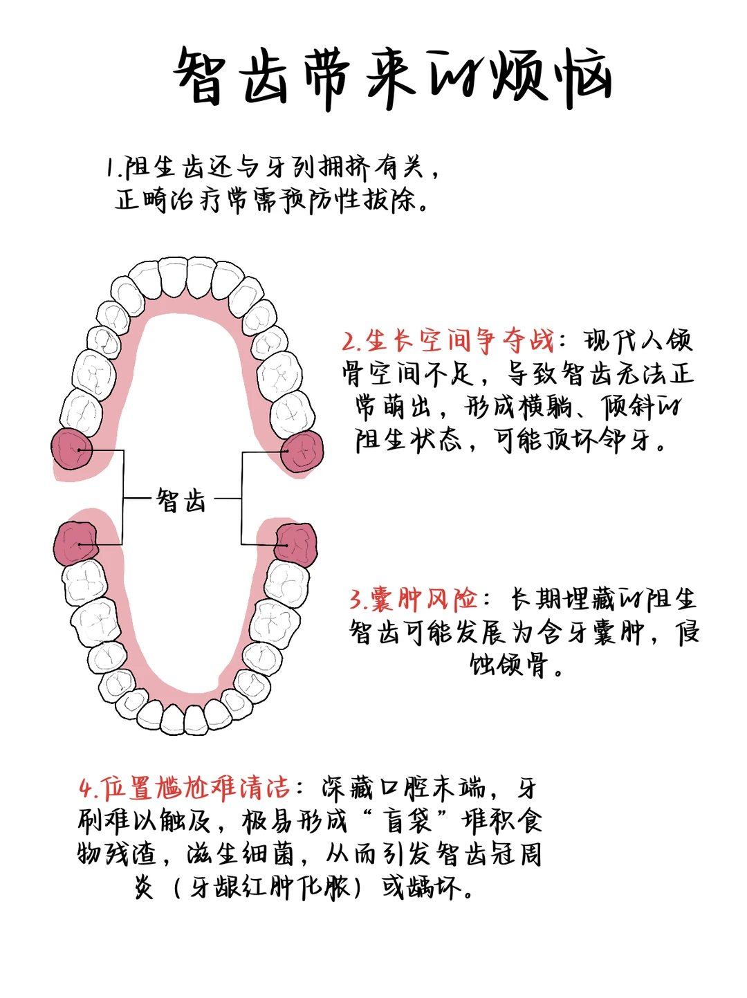 ✨智齿会给我们带来1.位置尴尬难清洁2.生长空间争夺战3.囊肿风险等,具体可以看图p2喔~