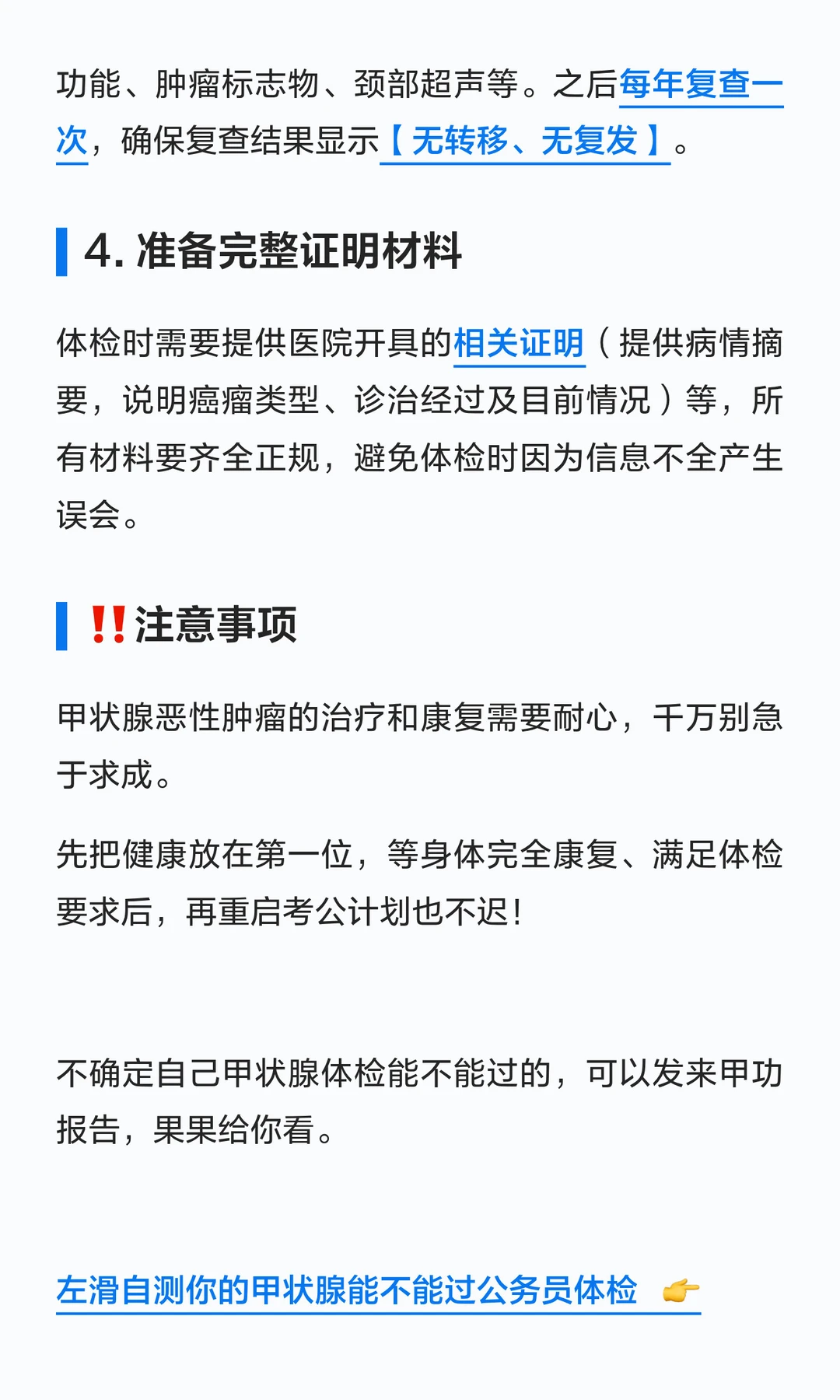 所以即使查出有甲状腺肿瘤也先别慌,先及时治疗,术后也遵医嘱积极干预,保证在不复发不转移的情况下再去备考,还是可以顺利通过公务员体检的~