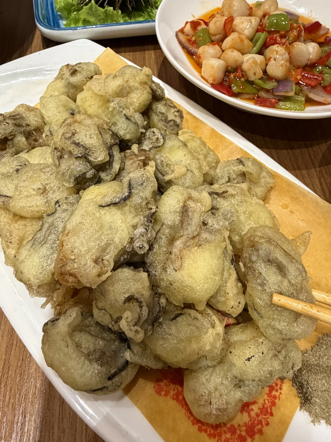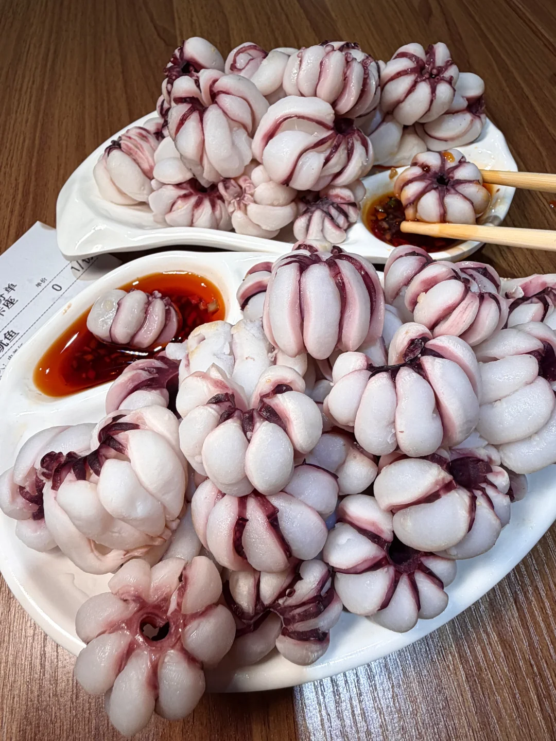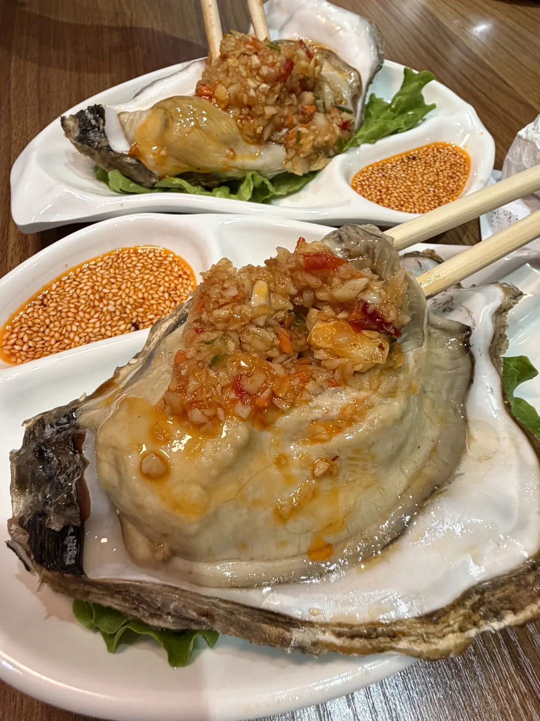 樱花鱿鱼头一次吃!比想象的好吃😋很新鲜,吃起来qq的!他家的生蚝个头拳头大,虾球香香辣辣,一口一个!