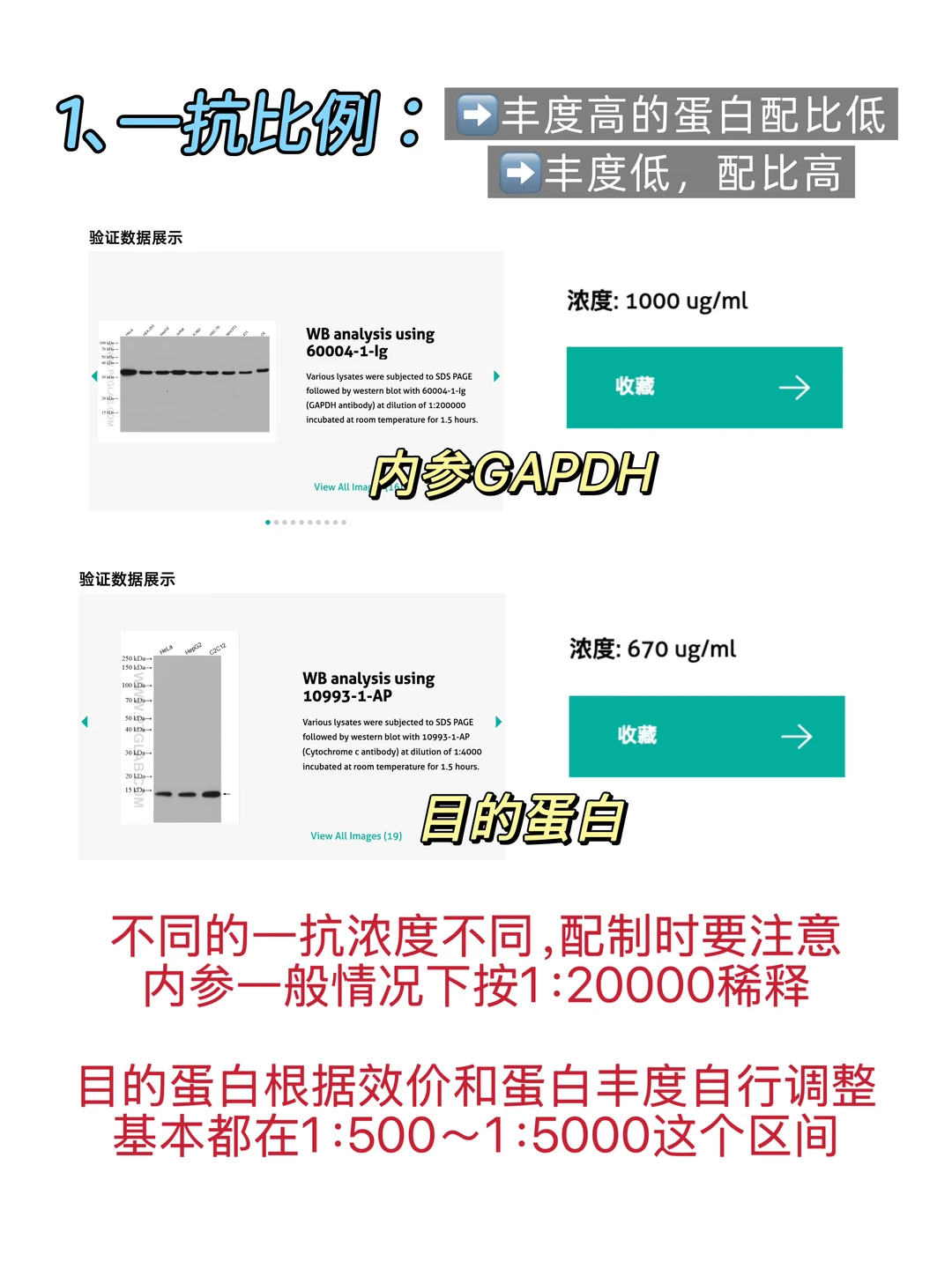 内参一般为1:20000稀释,甚至可以1:40000,目的蛋白根据实际情况调整,一般为1:500~1:5000。蛋白丰度高就调高稀释比例,丰度低就降低!可以先做预实验去调整~