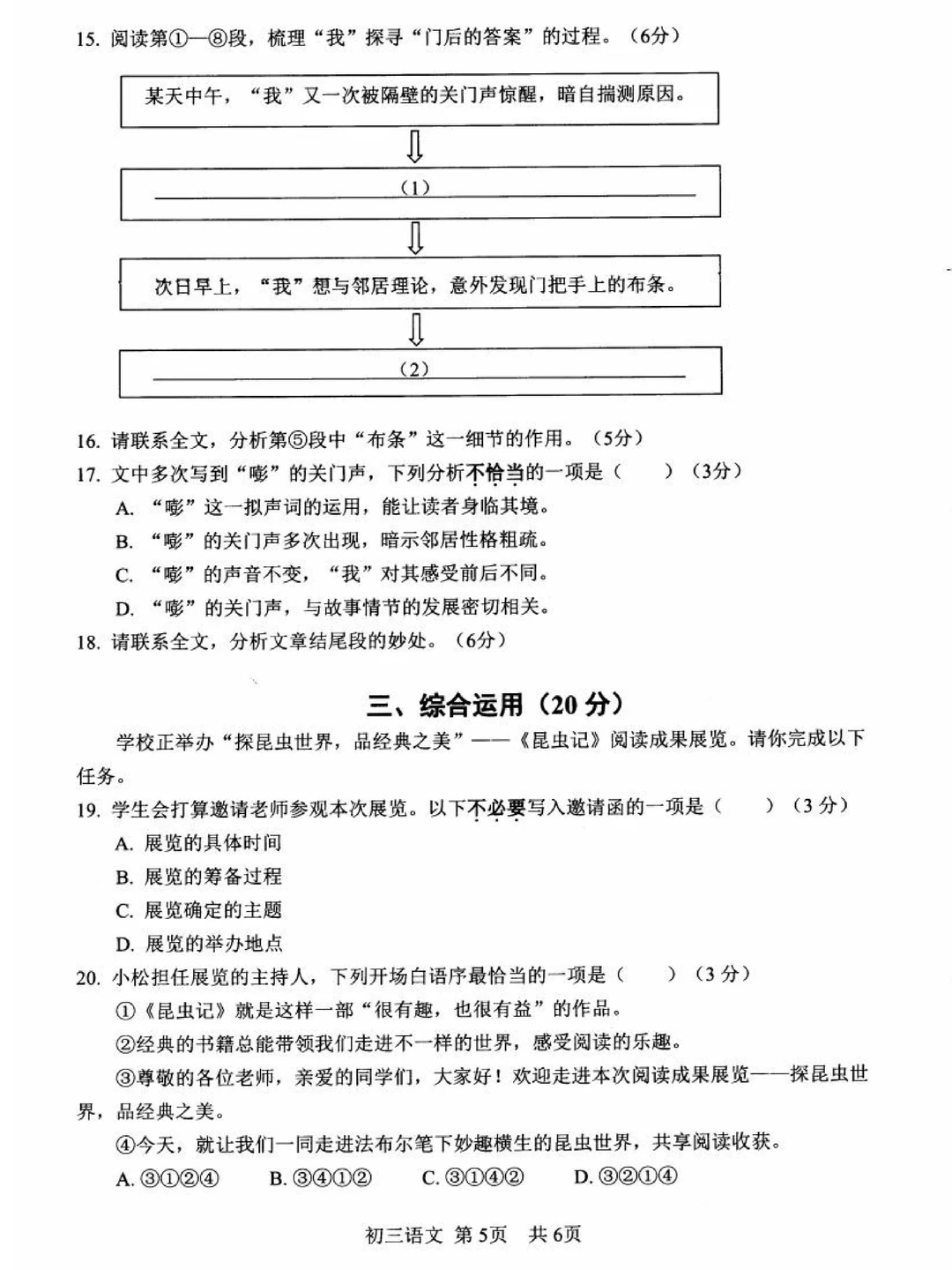 文言文考“人物手法”;现代文考“说明顺序”“结尾段妙处”等;综合运用考《昆虫记》;作文为“全命题”