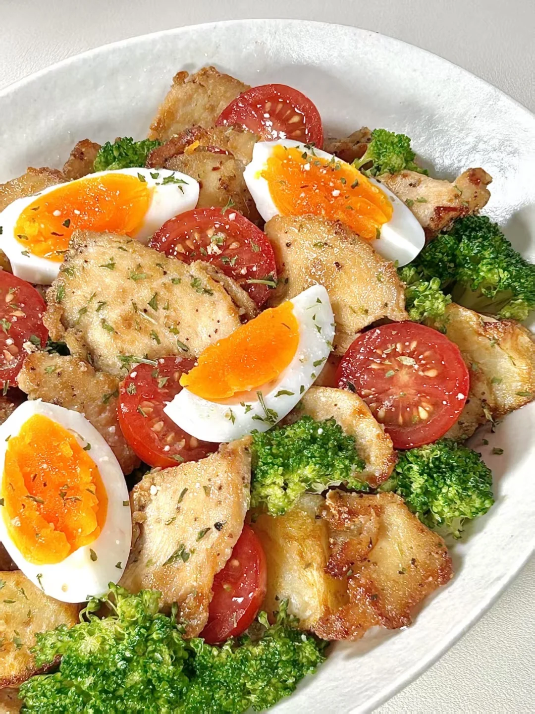 鸡胸肉、土豆、西兰花、圣女果、鸡蛋、海盐黑胡椒、辣椒粉、孜然粉、橄榄油、欧芹碎