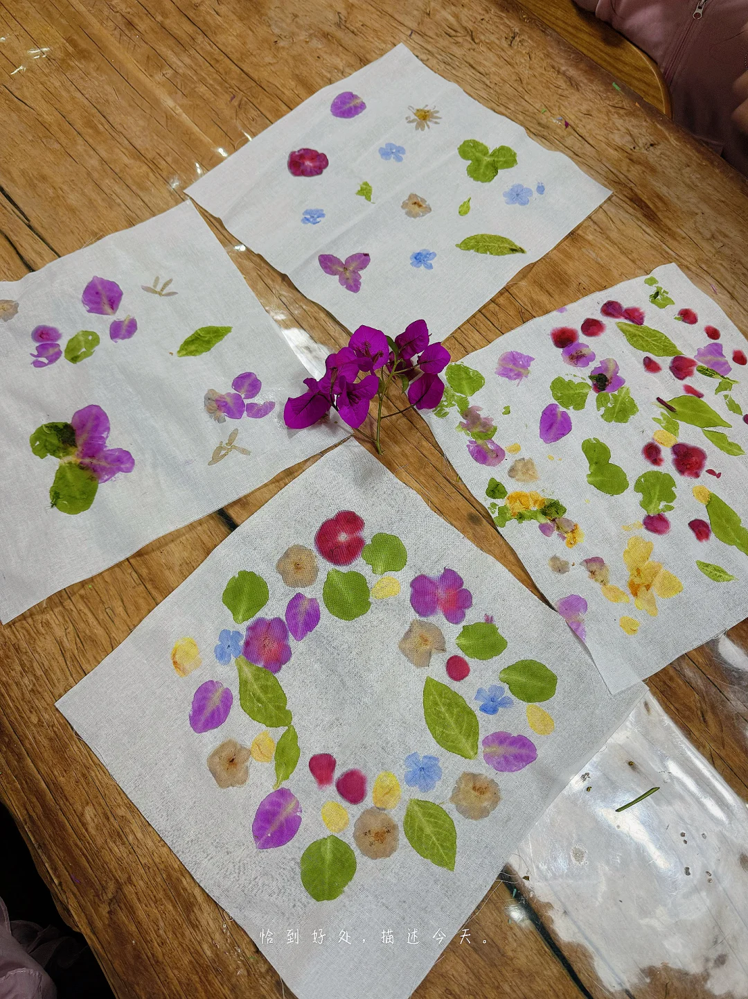 院子里摘的三角梅、路边的小野花,在小朋友的敲打下,变成了布上温柔的色彩。