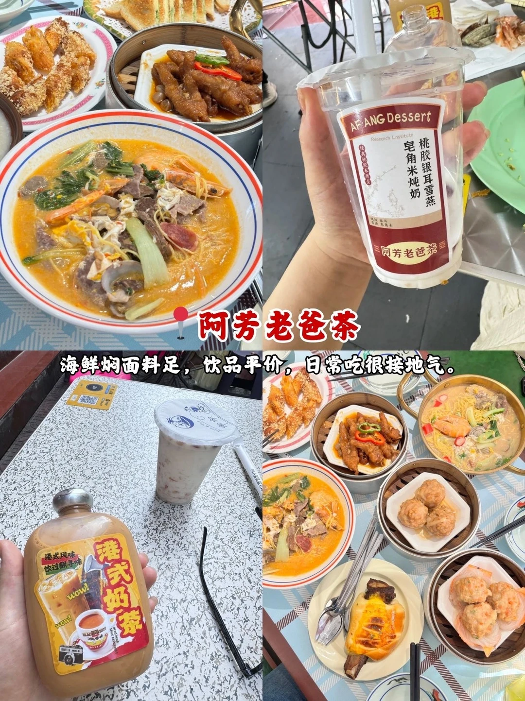 📍阿芳老爸茶:海鲜焖面料足,饮品平价,日常吃很接地气。