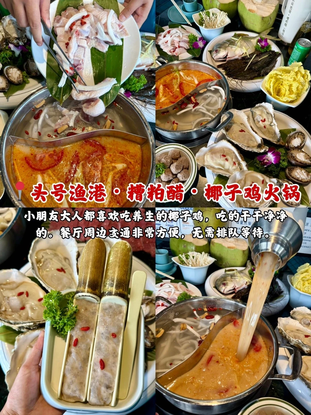 📍头号渔港・糟粕醋・椰子鸡火锅:服务员小姐姐很好,会帮你下菜,体验感非常的不错。小朋友大人都喜欢吃养生的椰子鸡,吃的干干净净的。餐厅周边交通非常方便,无需排队等待。