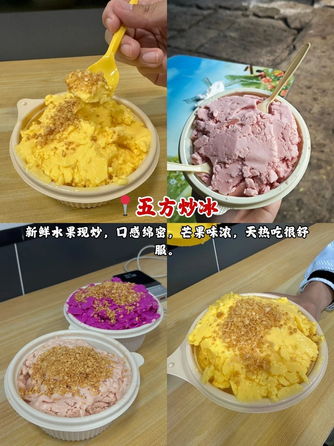 📍五方炒冰:新鲜水果现炒,口感绵密,芒果味浓,天热吃很舒服。