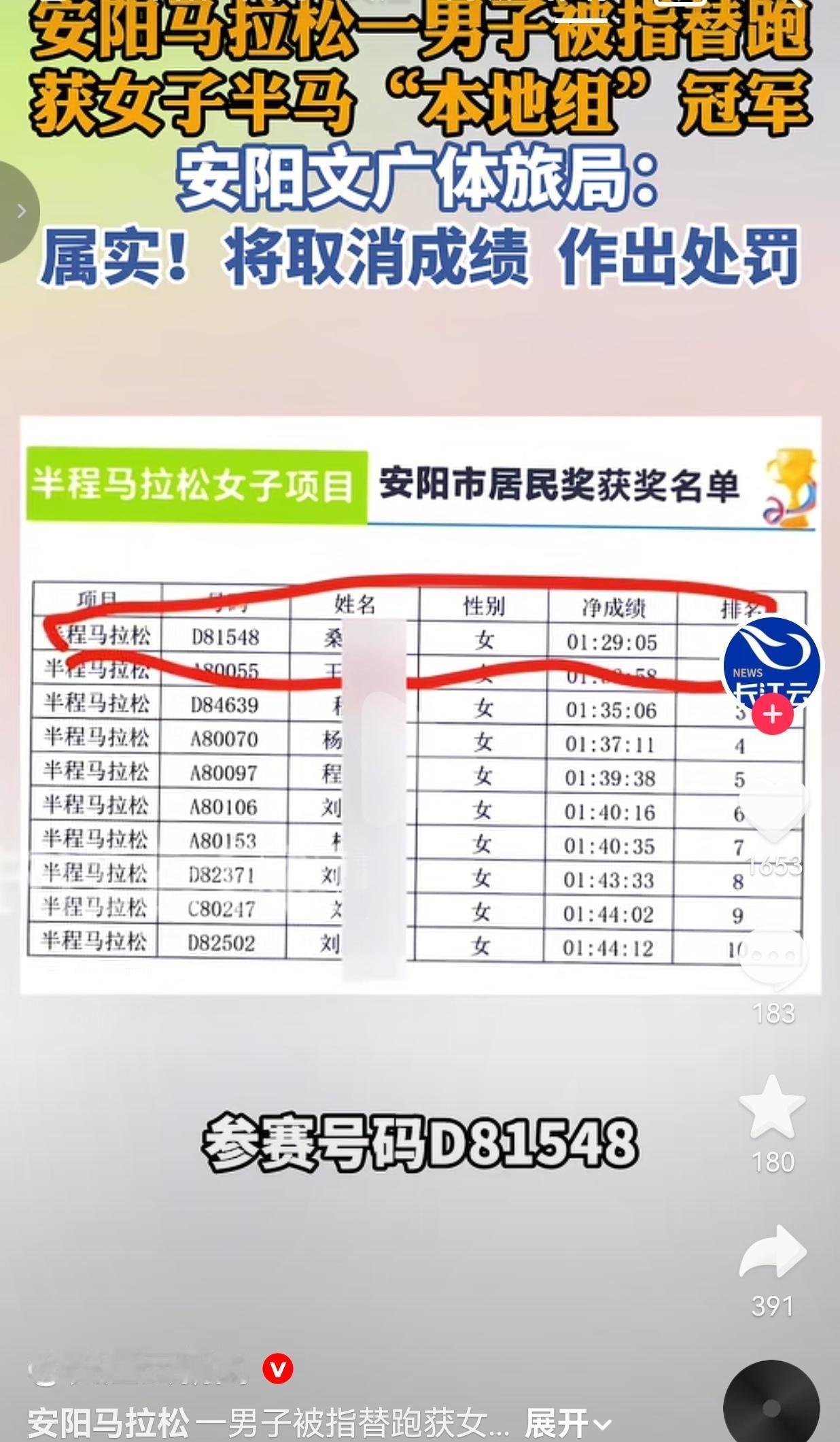 官方后来也实锤了,安阳文广体旅局直接确认,替跑属实,成绩取消,奖金追回,后续还要追加处罚。