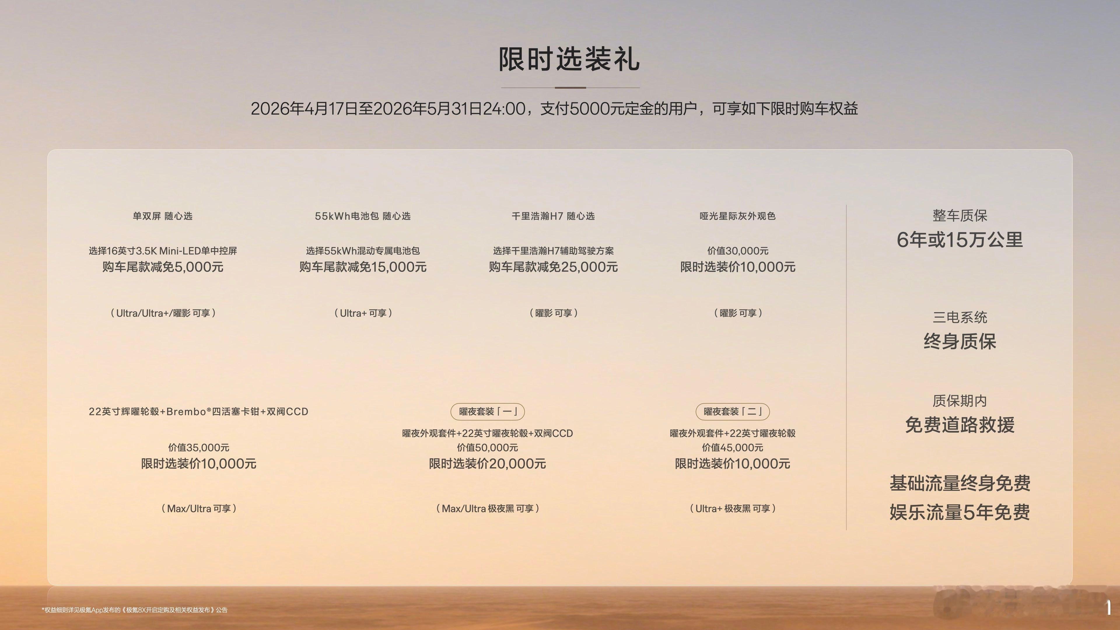 智能方面搭载双8295芯片、WAM模型与超级Eva,智驾提供H7、H9两种方案。车辆采用大五座布局,舒适性配置齐全。上市期支付定金可享多项零元选装与补贴权益,有效期至2026年5月31日。