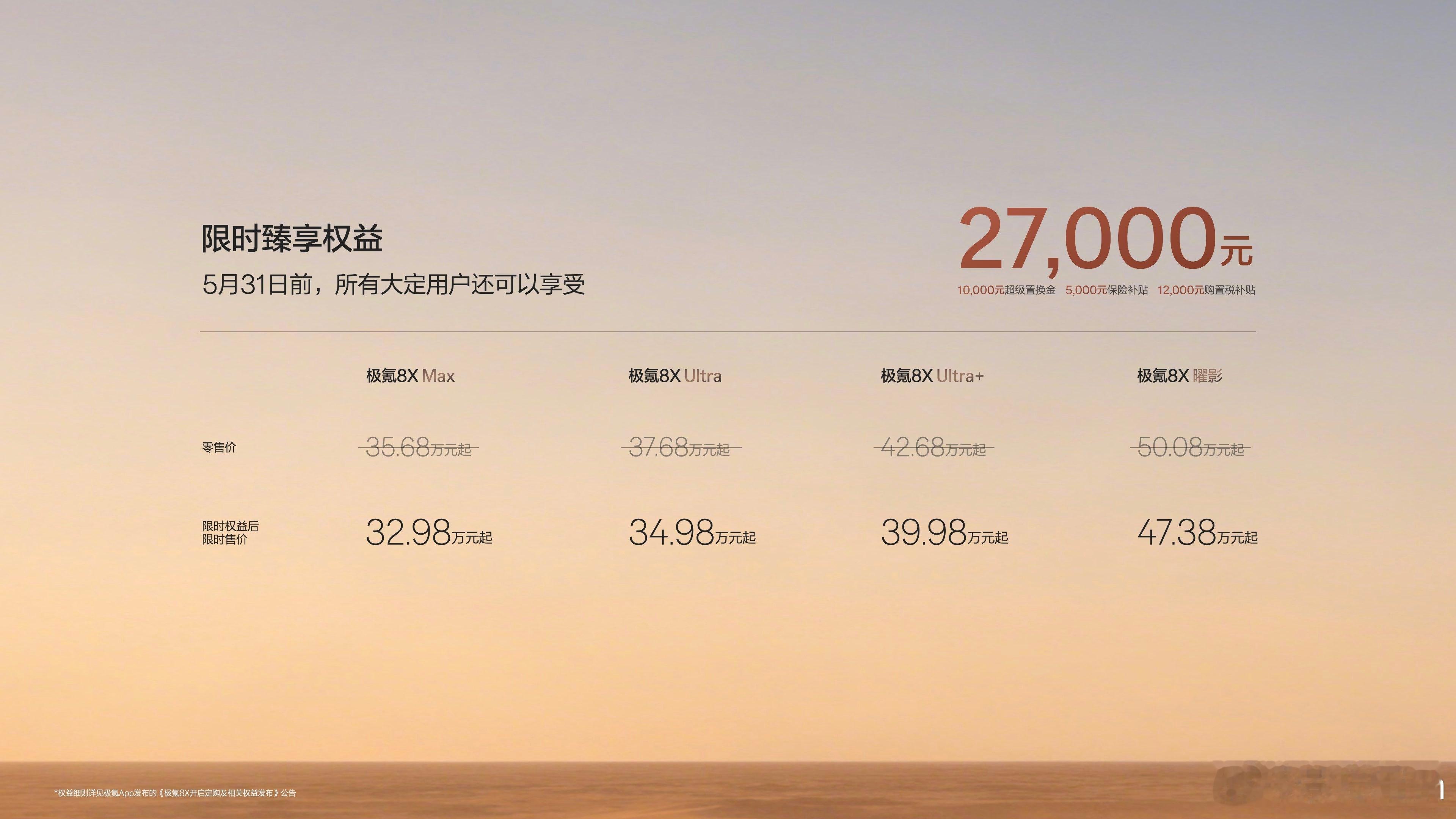 极氪8X上市限时售价32.98万元起极氪8X正式上市,定位超级电混高性能旗舰SUV,推出四款配置,限时权益后售价32.98-47.38万元。新车基于SEP浩瀚超级电混架构打造,全系搭载900V高压平台与70度6C混动电池,纯电续航410公里,综合续航最高1416公里。