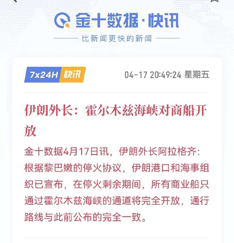 4月17日晚,伊朗外长宣布,霍尔木兹海峡对所有商船全面开放,通行路线恢复战前状态,持续近两个月的通航紧张正式缓解。消息一出,国际油价应声大跌,市场情绪瞬间反转。