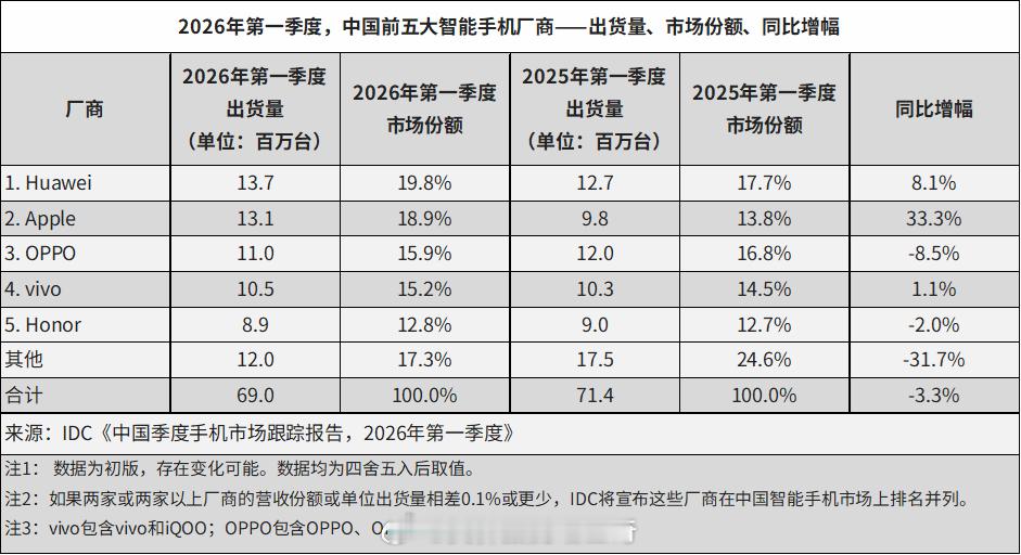 Omdia、IDC、Counterpoint三大市调机构统计的一季度手机销量前四名都是华为、苹果、OPPO、vivo,第五名有区别。