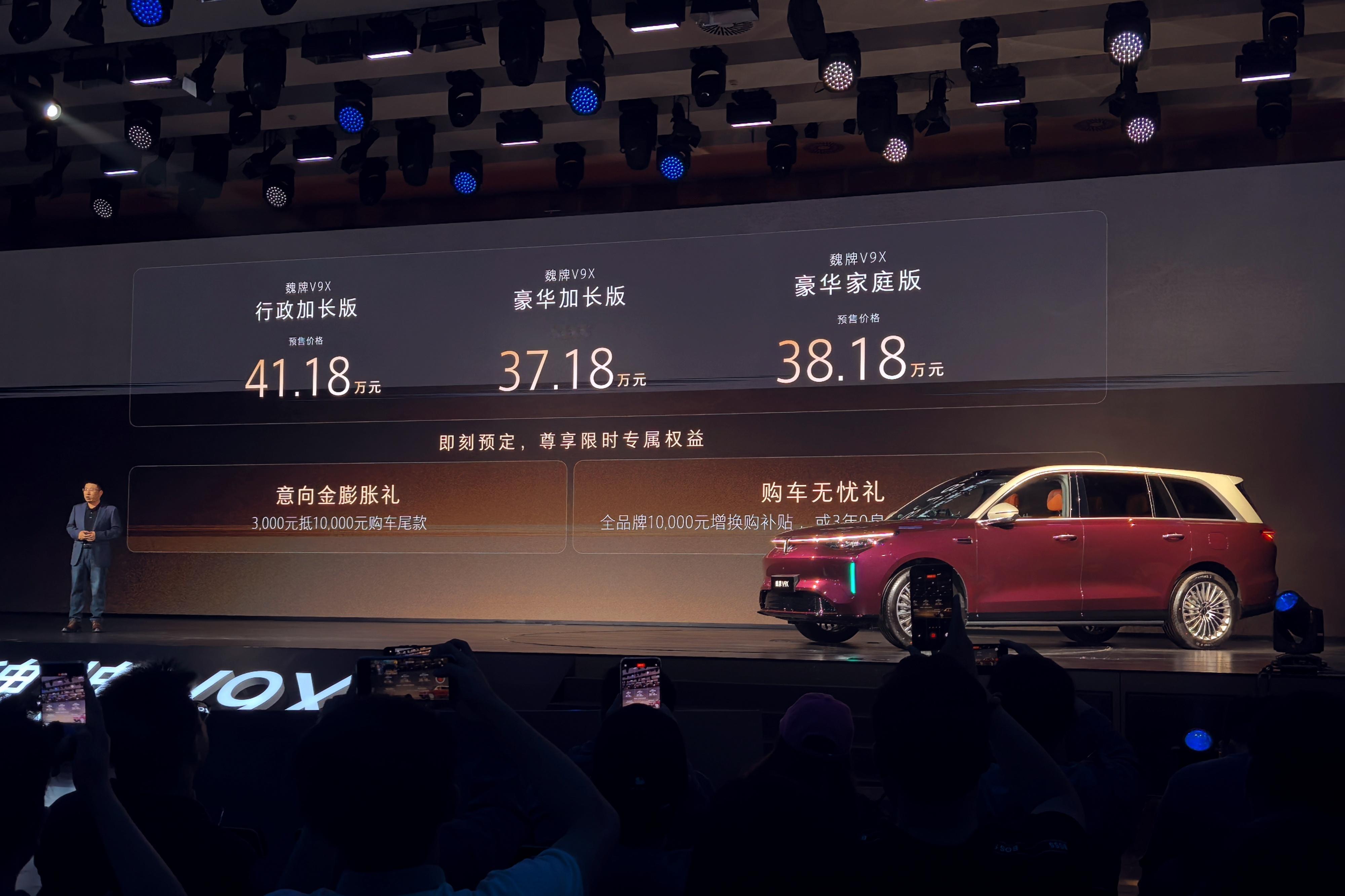 魏牌V9X预售37.18万起,标轴比加长版贵一点是因为电池和平台配置是不一样的,38.18万的豪华家庭版是66.6度电池,800V平台;37.18万的豪华加长版是55.4度电池,400V平台。V9X基于车型全栈自研的归元S平台,这可以说是百万级平台,也是世界上最先进的平台之一,可以兼容纯电、燃油、混动、插混、还有氢能源,V9X后续也会有纯电版。V9X的产品力全面的强大,像高山一样,各方面都很极致,我非常看好它的市场表现,长轴标轴全都有真的很科学,总有一款适合你。魏建军为魏牌V9X品质背书魏牌V9X正式开启预售百万级AI汽车平台归元S面世归元S平台将引发汽车产业质变