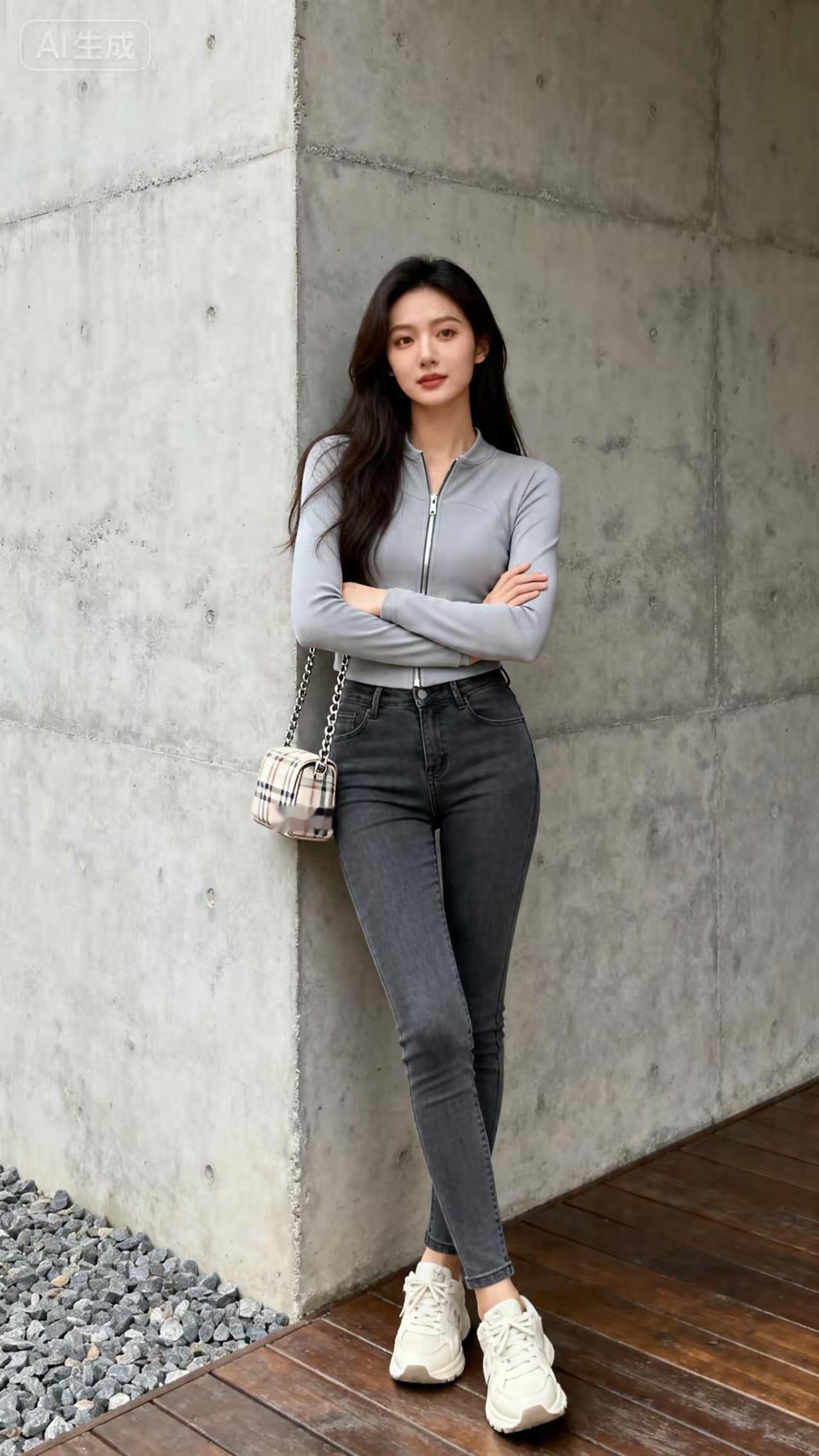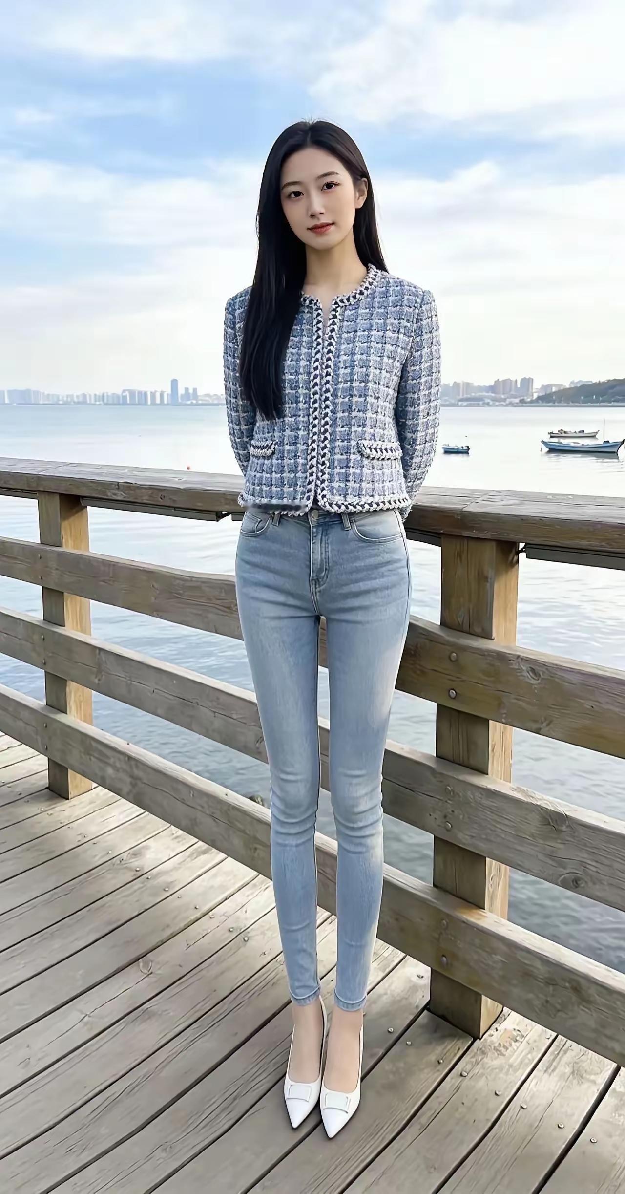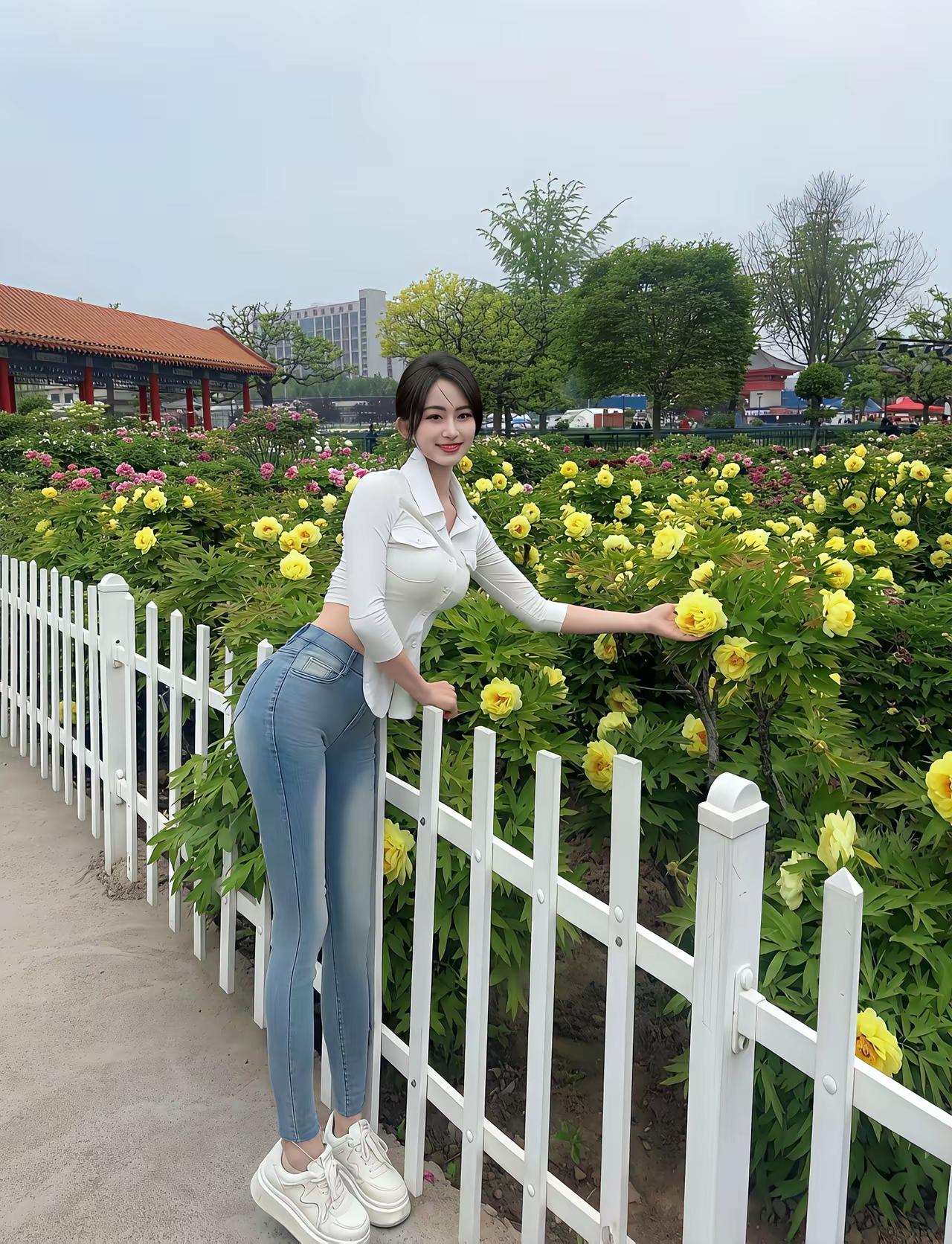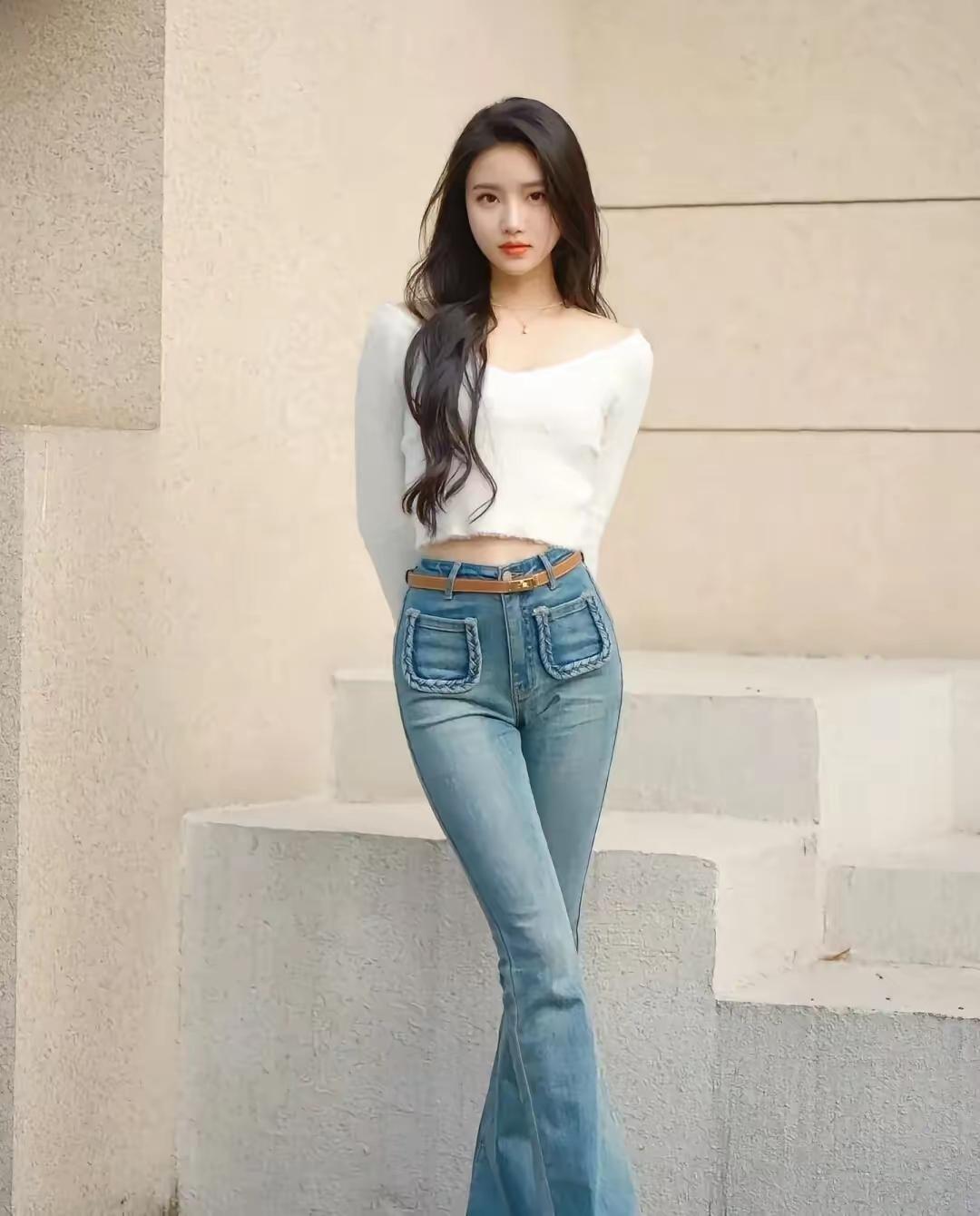 阳光下的清新少女,白色上衣与牛仔裤的完美搭配,轻松自然,元气满满!🌞