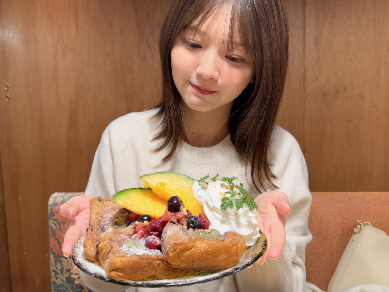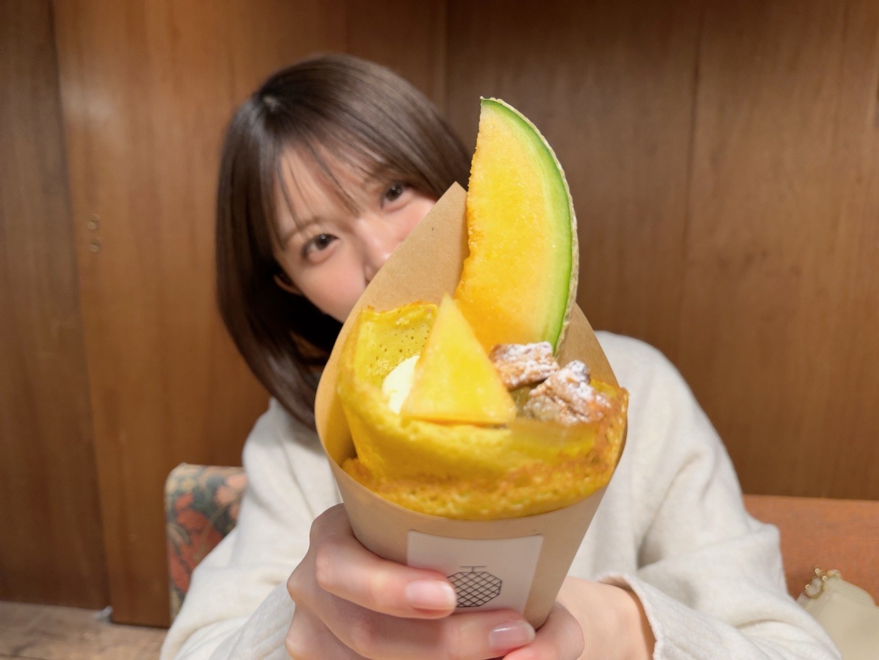 山下葉留花「また最近メロン巡りしてきました🍈メロンクレープ!!生地にもメロンの風味を感じましたし、大好きなフロランタンも入ってました!!サイコー こちらは、メロンフレンチトースト!!ラズベリーとかの酸味がちょうど良くて、お母さんが大興奮してました!」