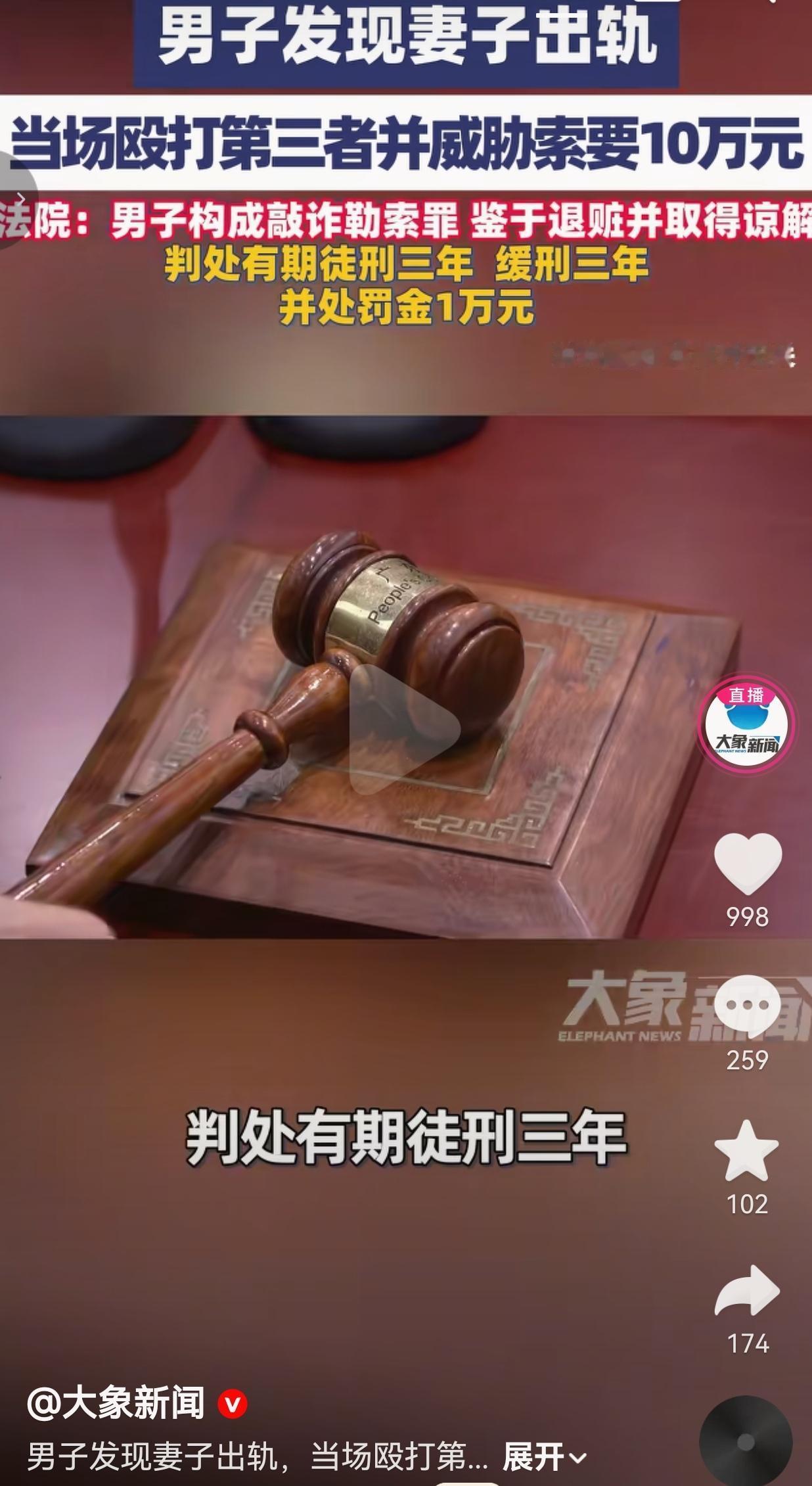 抓奸反被判刑!丈夫捉奸后索要10万赔偿,最终自己被判缓刑。