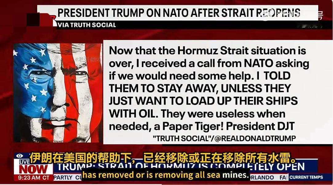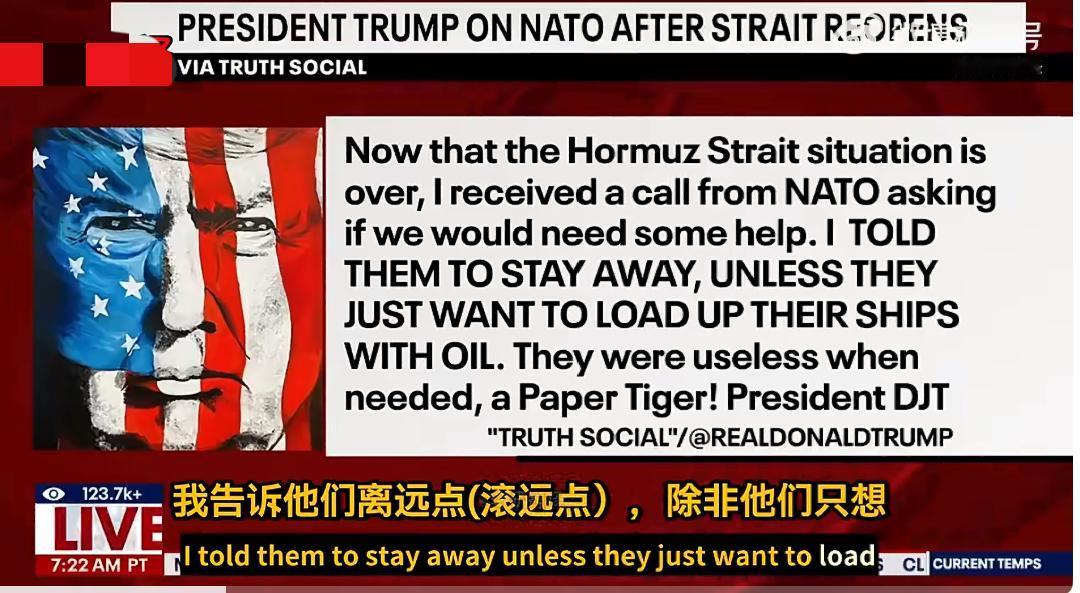 特朗普:霍尔木兹海峡重新开放后,北约来电询问是否需要帮忙,我让他们离远点(滚远点)!