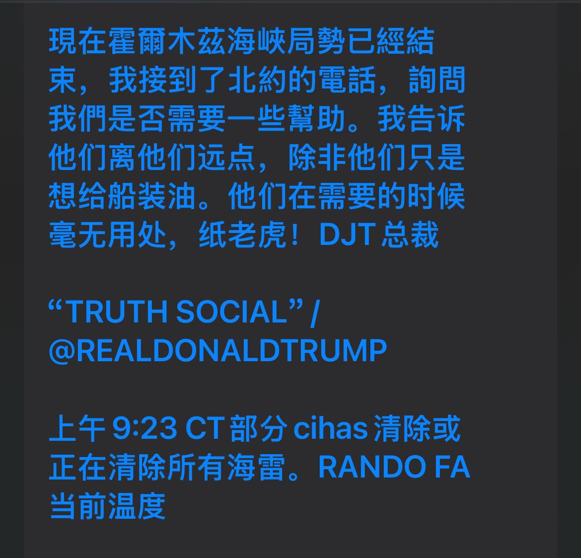 美国总统特朗普在 Truth Social 上发文称,霍尔木兹海峡局势平息后,他接到北约电话,对方询问美国是否需要协助。