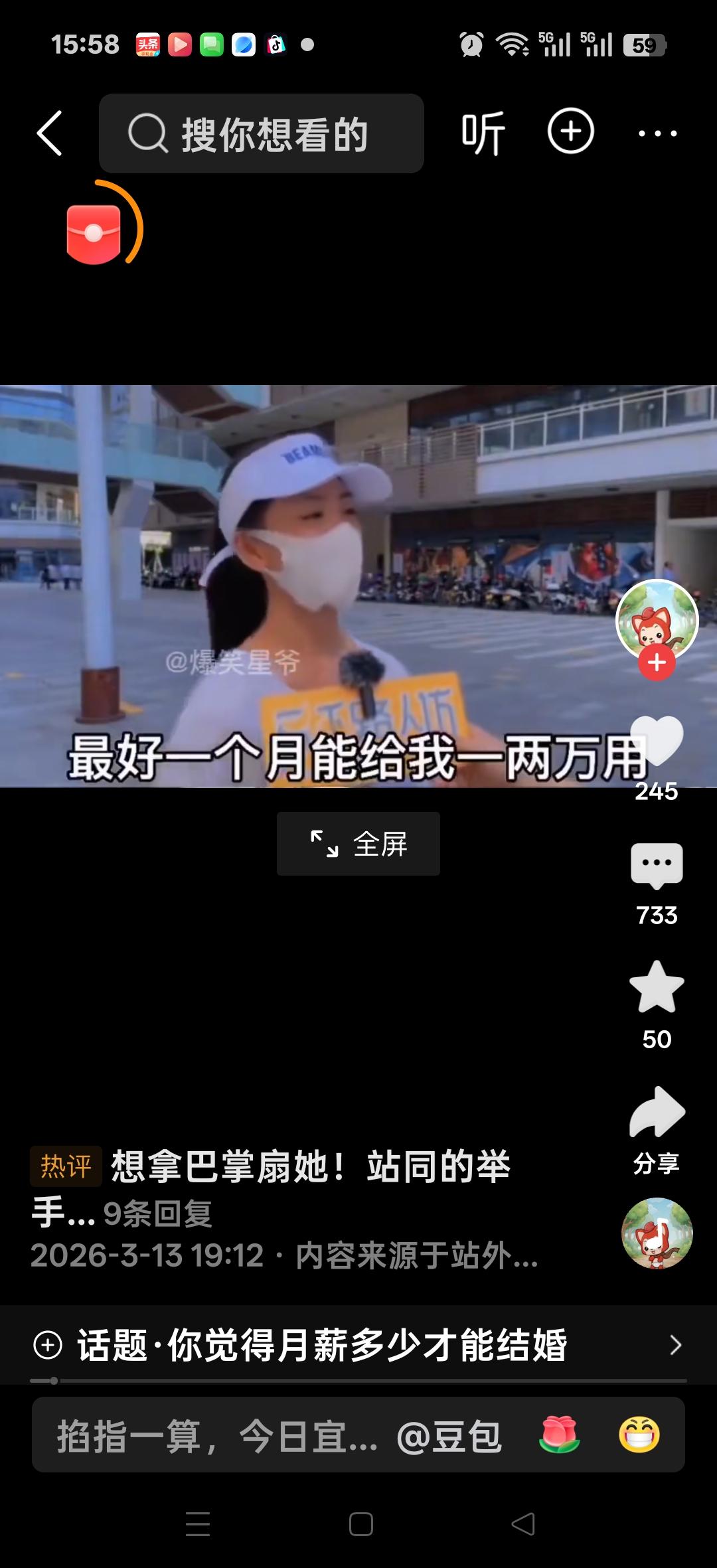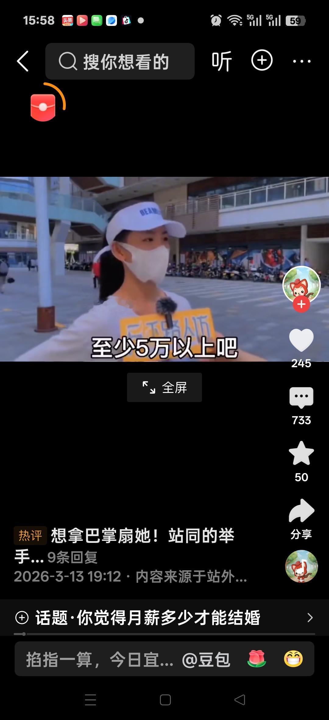 街访:你会嫁给一个月薪5000的男人吗?女子:不会,我要求男子身高1.8以上,至少每个月收入5万以上,最好能一个月给我一两万用。网友说:心比天高,命比纸薄。想拿巴掌扇她,赞同的请举手!有的人说:美女,你去问问,现在各行各业各公司各工厂,每年每个员工每月工资多少钱?去打听打听,一般都在五六千。有的人说:弱弱的问一句,社会上有多少30岁以内月薪5万的?姑娘,你的要求太低了,让马云考虑一下,刘强东也不错。这样的要求,等到60也找不到,到庙里许愿还可以。有的人说:狮子大开口,不看看自己能赚多少钱。30岁以前能挣3万的月工资,估计10%都没有吧?女孩真给力,一定方针,一定不要变啊,坚持就是胜利,聪明,智慧,明智都是一流的,大家说是这样的吗?