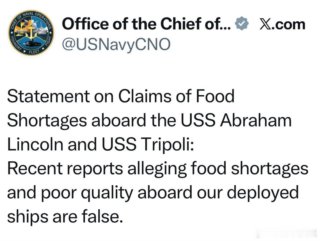 美国海军运营总长公开辟谣:关于林肯号航母、的黎波里号两栖攻击舰上食物短缺的传闻,