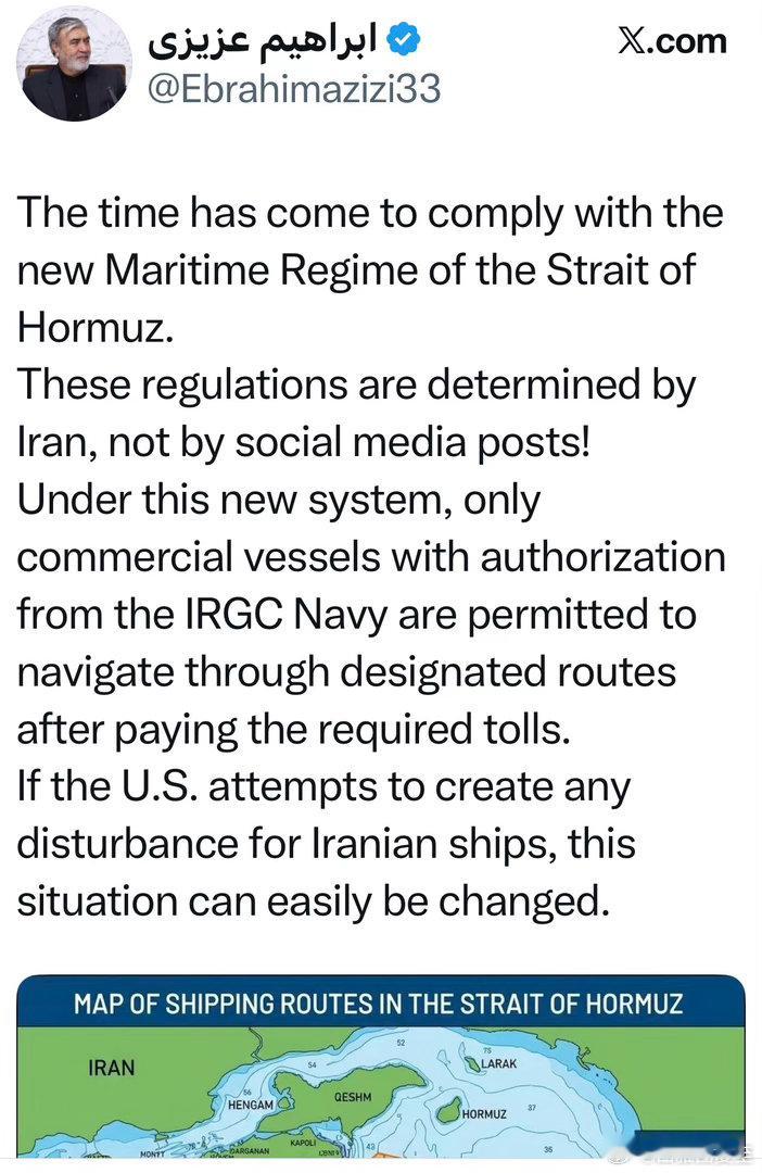 伊朗国安委声明:规则由我们定,不是社媒贴…革命卫队批准、交了过路费的商船,可从指定航线通过