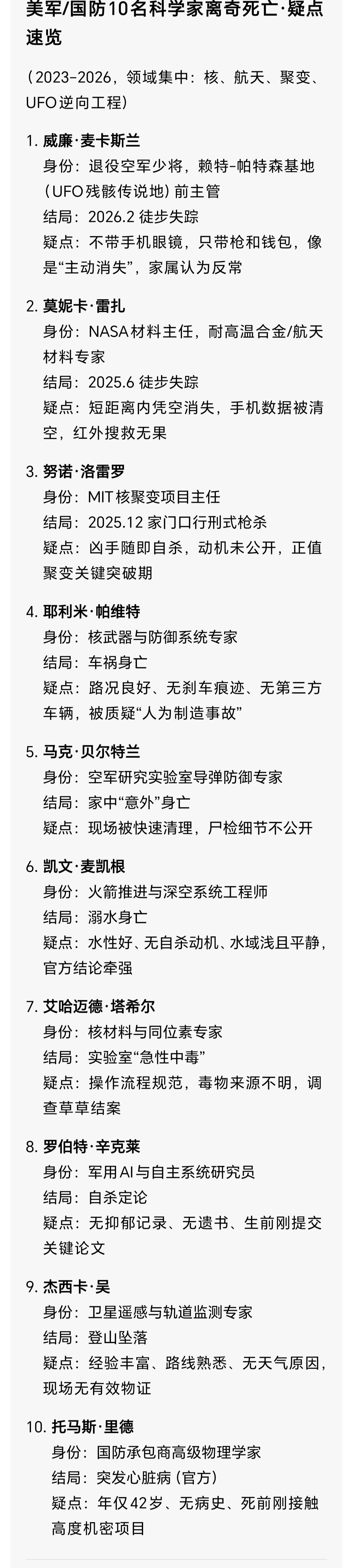 2026年4月美国最火的阴谋论:10名美军/国防顶尖科学家(核、 航天、UFO领域),2023-2026年接连离奇死亡/失踪,官方全是“意外/随机/自然死亡", 但疑点重重。