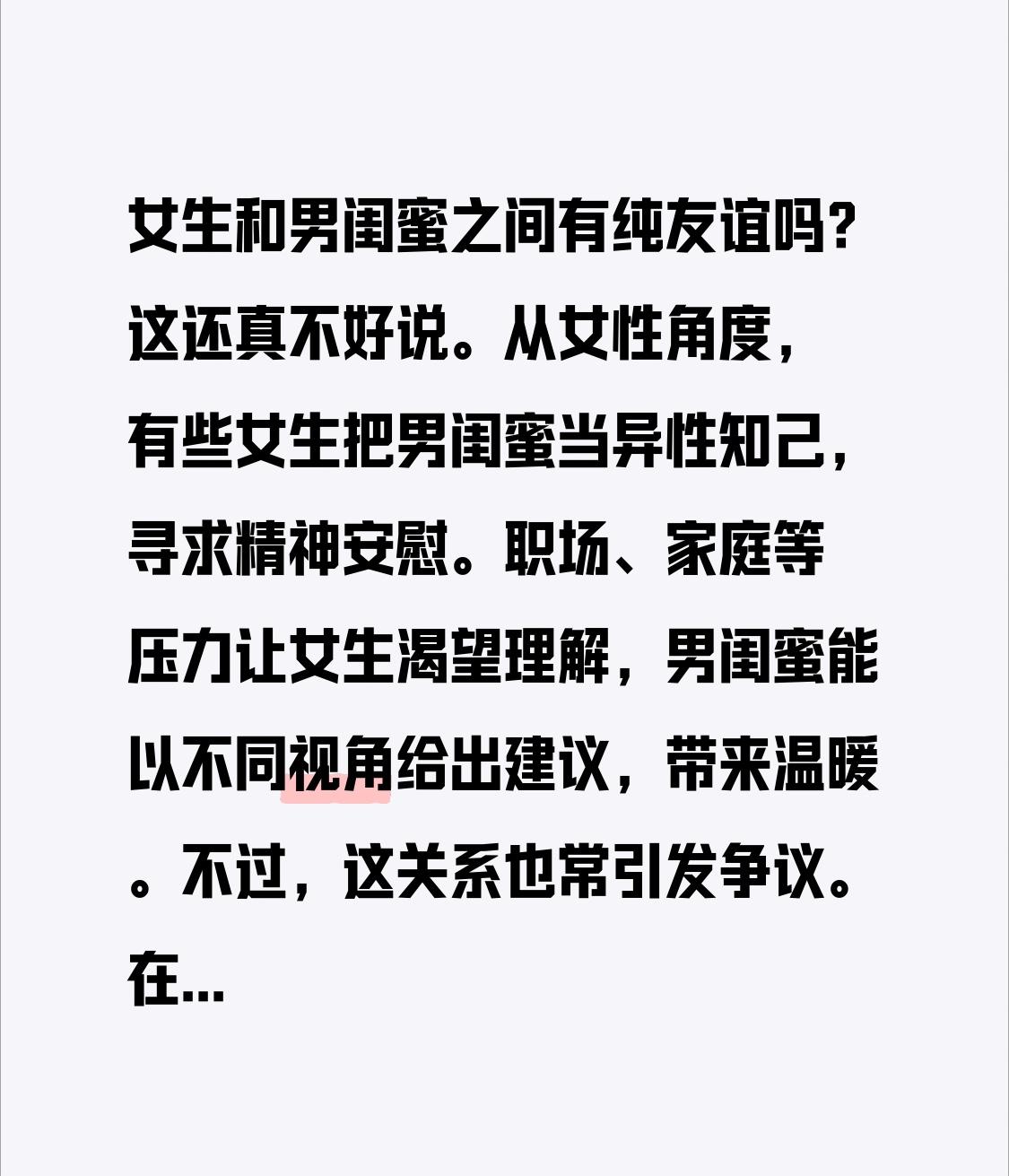 女生和男闺蜜之间有纯友谊吗?这还真不好说。从女性角度,有些女生把男闺蜜当异性知己,寻求精神安慰。职场、家庭等压力让女生渴望理解,男闺蜜能以不同视角给出建议,带来温暖。