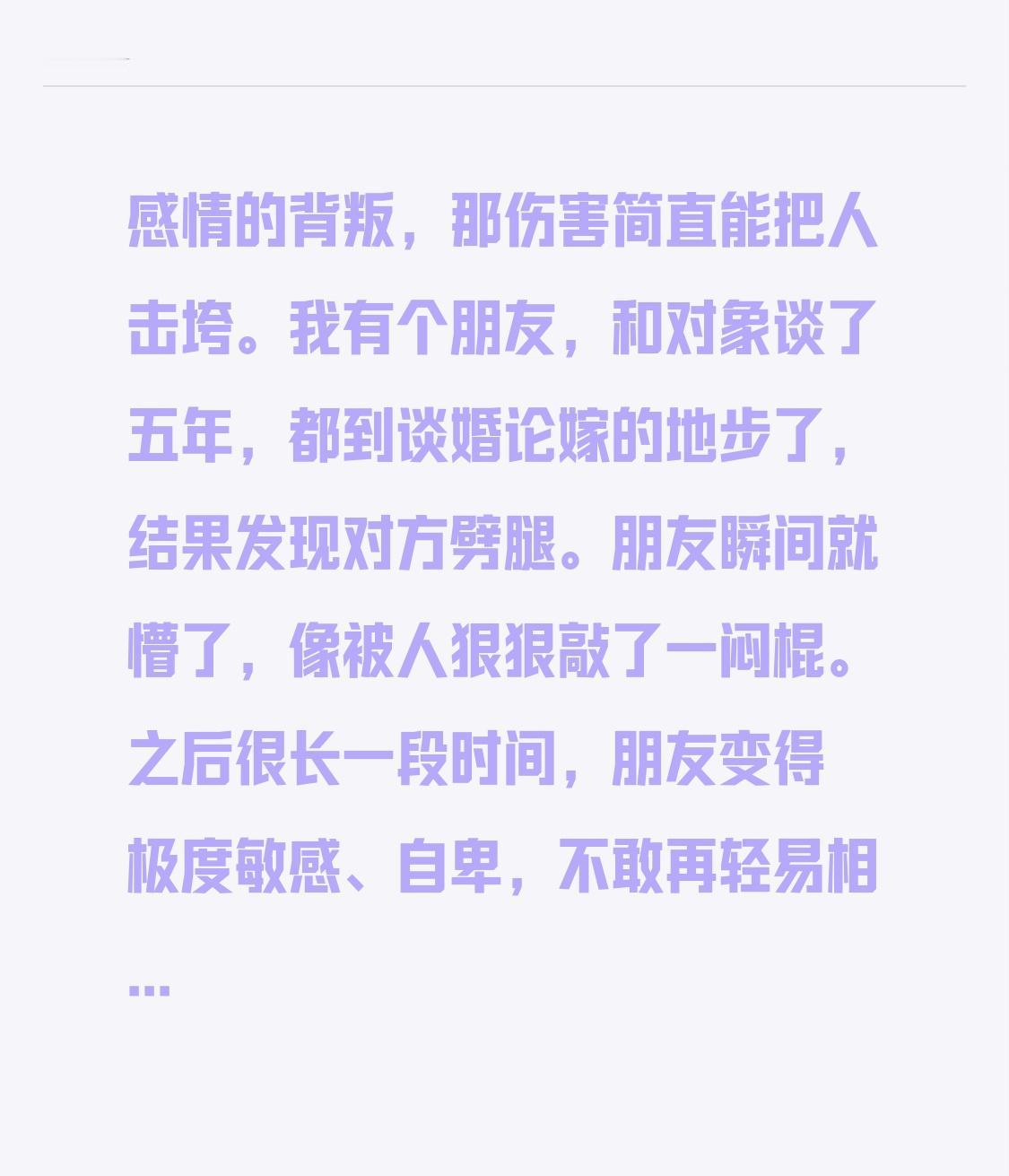 之后很长一段时间,朋友变得极度敏感、自卑,不敢再轻易相信别人。工作也没了状态,业绩直线下滑。原本开朗的性格变得沉默寡言,社交活动也都不参加了。背叛就像一颗毒瘤,侵蚀着人的内心,让人对爱情充满恐惧,甚至怀疑自己是不是不值得被爱。这种伤害,可能要用很久很久才能慢慢愈合。