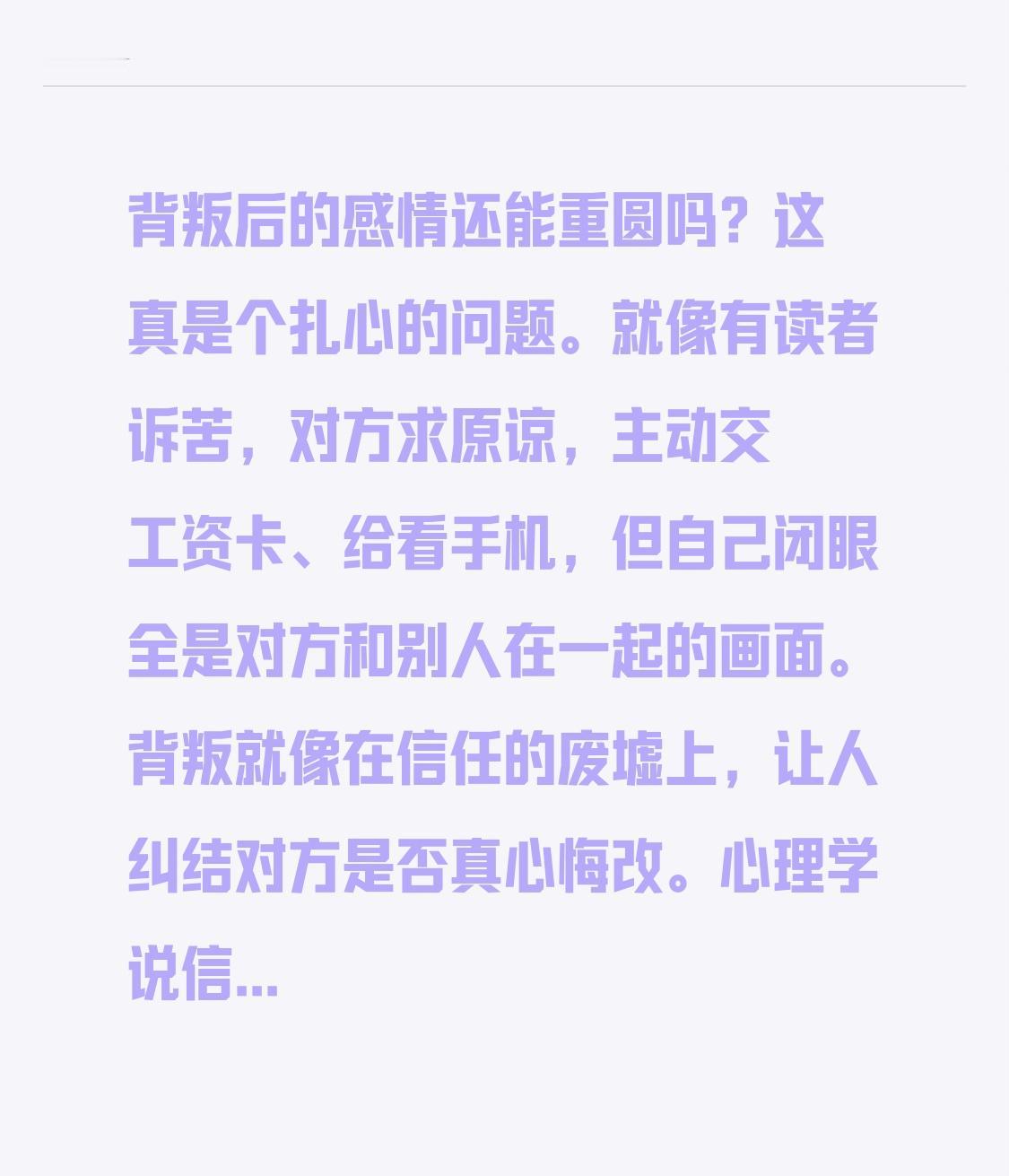 背叛后的感情还能重圆吗?这真是个扎心的问题。就像有读者诉苦,对方求原谅,主动交工资卡、给看手机,但自己闭眼全是对方和别人在一起的画面。