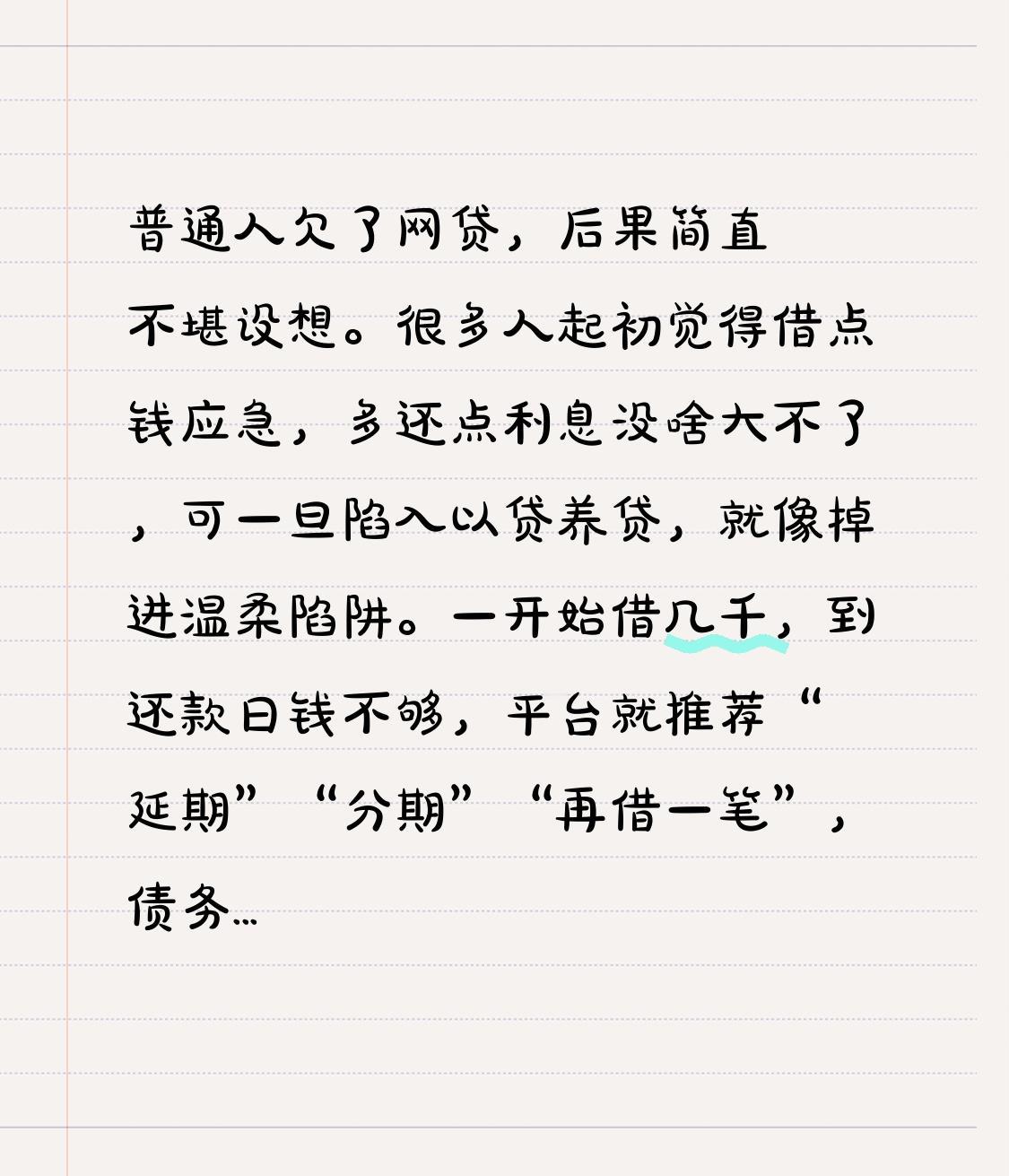 普通人欠了网贷,后果简直不堪设想。很多人起初觉得借点钱应急,多还点利息没啥大不了,可一旦陷入以贷养贷,就像掉进温柔陷阱。一开始借几千,到还款日钱不够,平台就推荐“延期”“分期”“再借一笔”,债务像滚雪球,半年就能从一万滚到十几万、几十万。