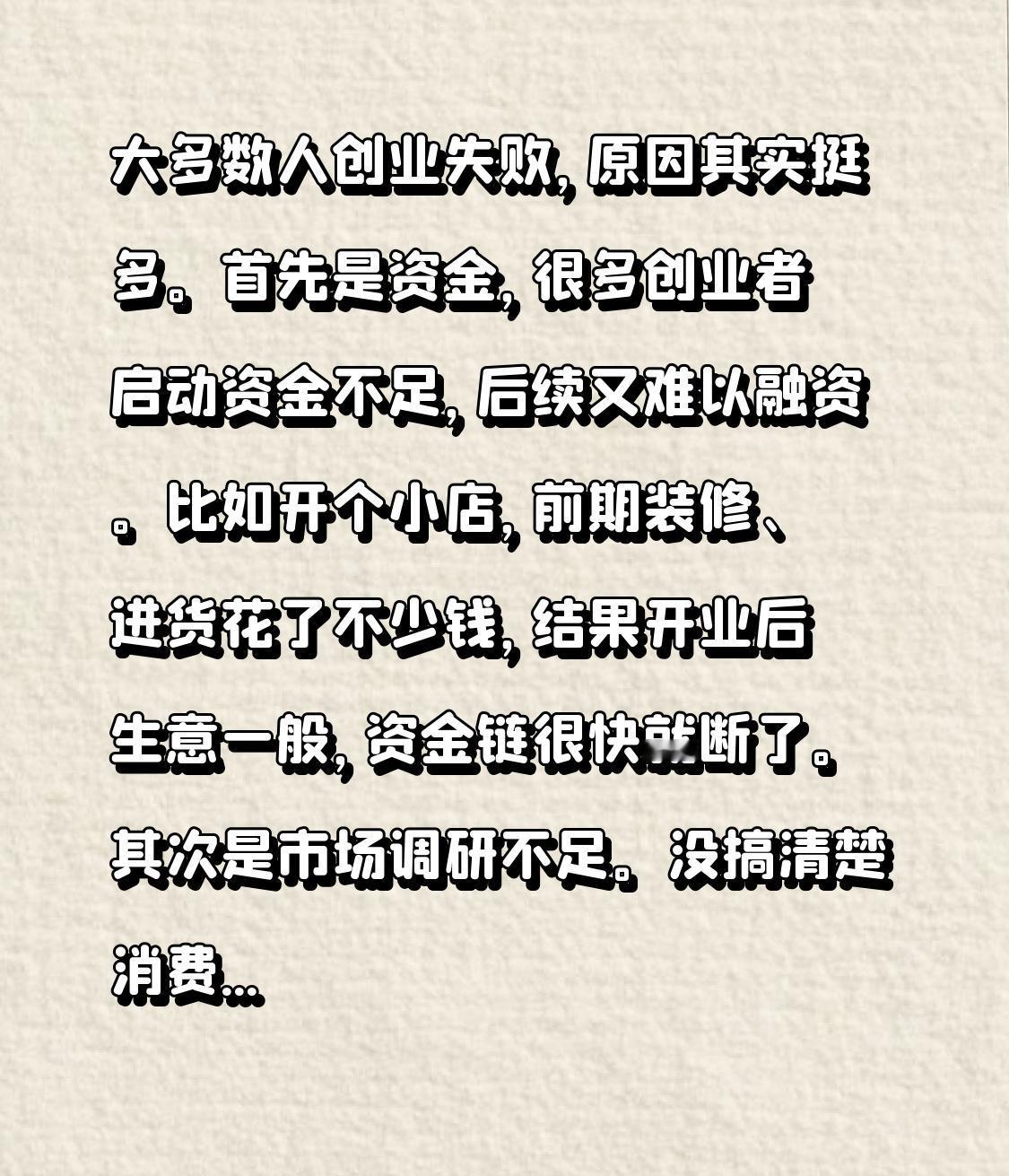 大多数人创业失败,原因其实挺多。首先是资金,很多创业者启动资金不足,后续又难以融资。比如开个小店,前期装修、进货花了不少钱,结果开业后生意一般,资金链很快就断了。