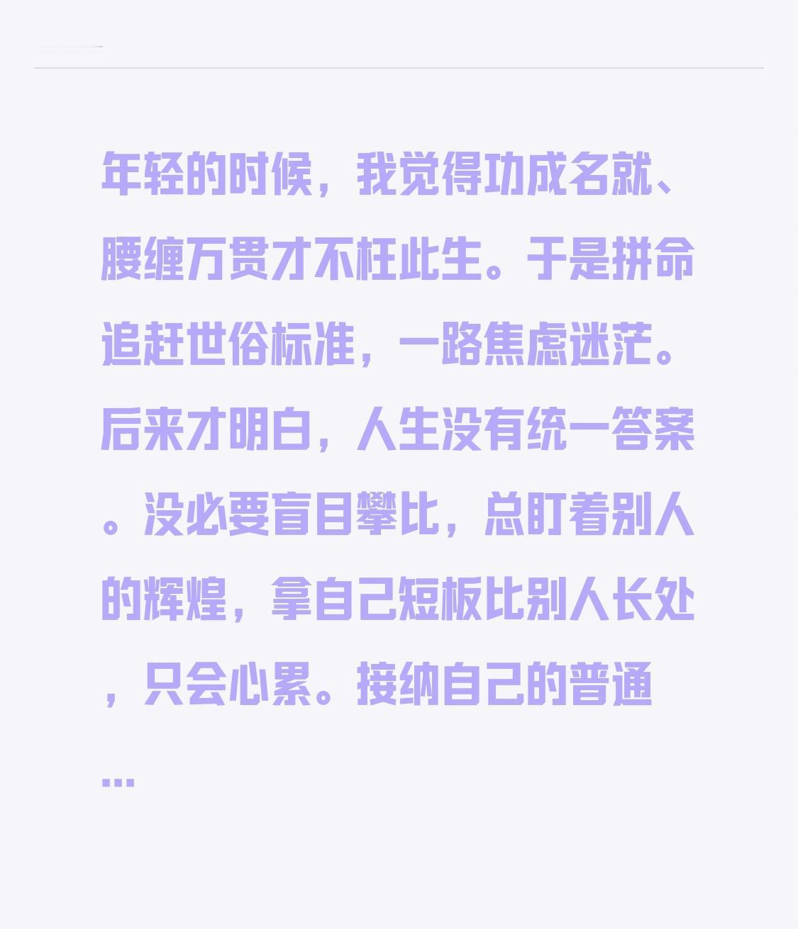 没必要盲目攀比,总盯着别人的辉煌,拿自己短板比别人长处,只会心累。接纳自己的普通,按自己节奏走,这份坦然就是意义。