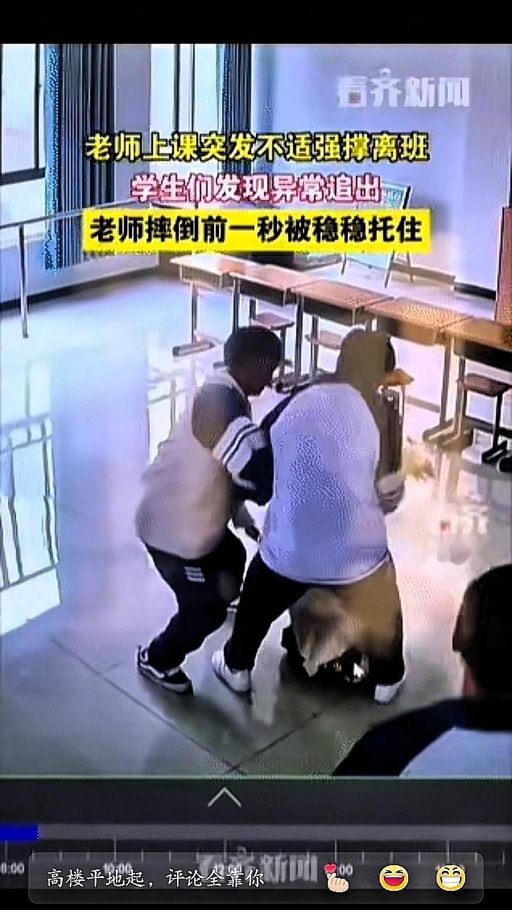 老师刚走出教室,脚步开始不稳,几名学生立刻跟了出去,在她即将摔倒的时候及时上前扶住。孩子们有条不紊,有的慢慢搀扶老师,有的找来椅子让她坐下,还有人第一时间去通知班主任。