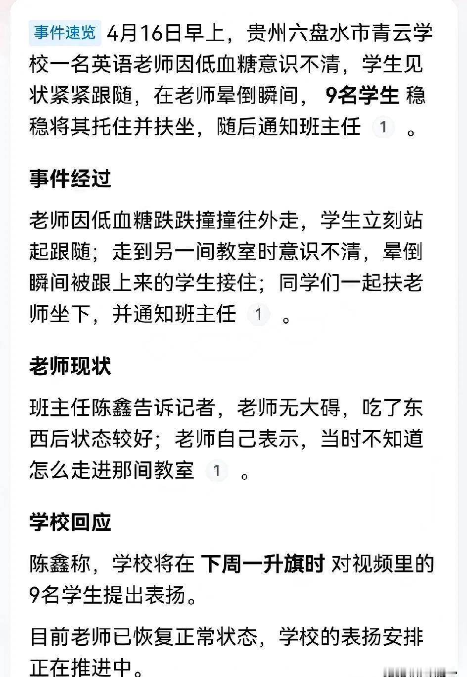目前这位老师经过休息调理,身体已经没有大碍。学校也表示,会在下周一升旗仪式上,当众表扬这九名懂事暖心的学生,鼓励这份善良。