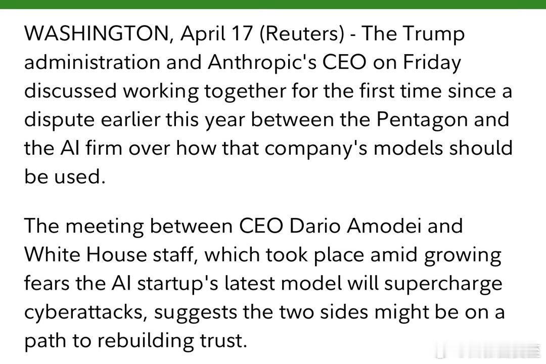 这是二月,因不同意国防部“AI控制自动武器、AI监控美国公民”,被列入“国家安全风险供应链黑名单”后,第一次与政府缓和关系