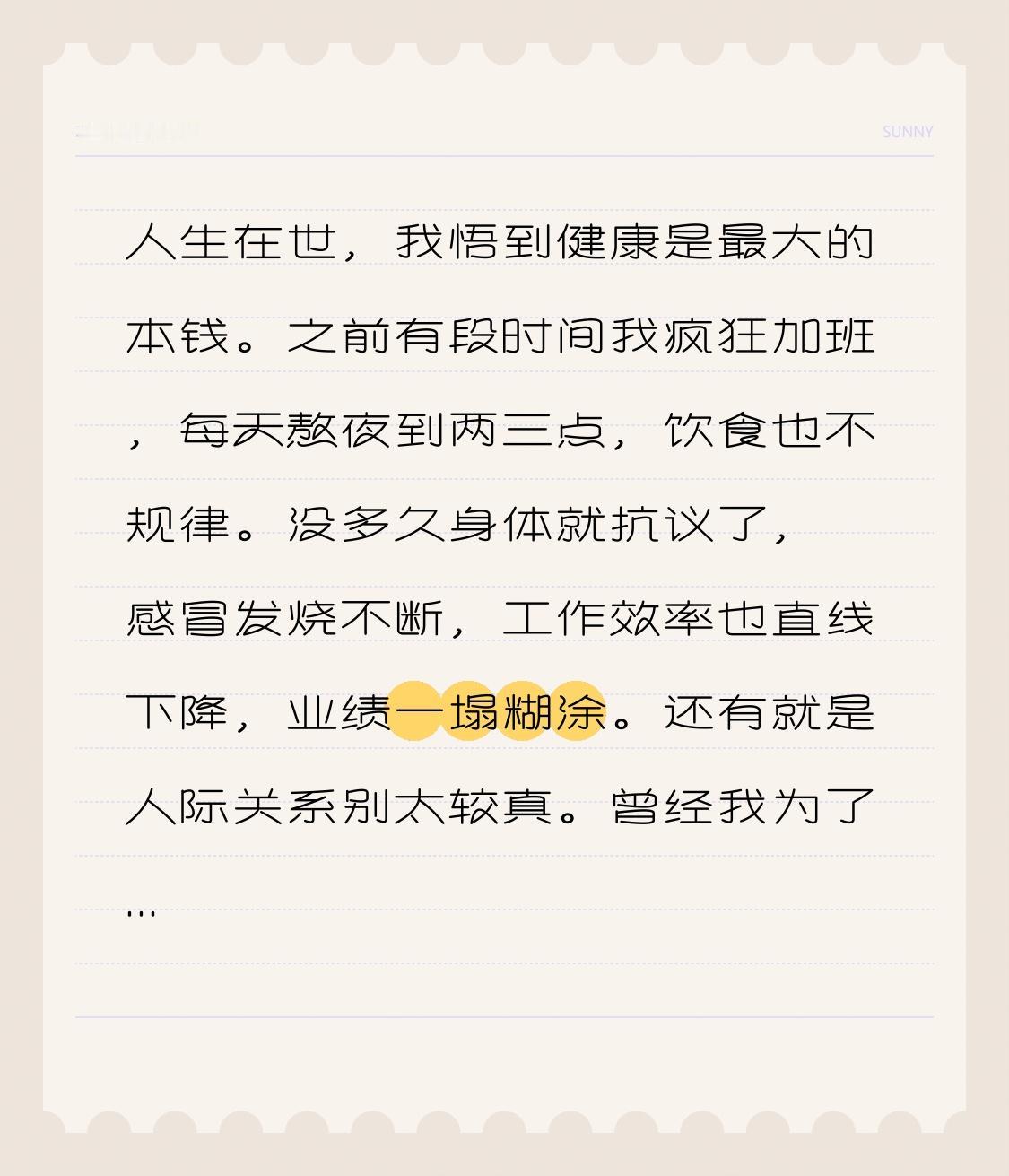 人生在世,我悟到健康是最大的本钱。之前有段时间我疯狂加班,每天熬夜到两三点,饮食也不规律。没多久身体就抗议了,感冒发烧不断,工作效率也直线下降,业绩一塌糊涂。