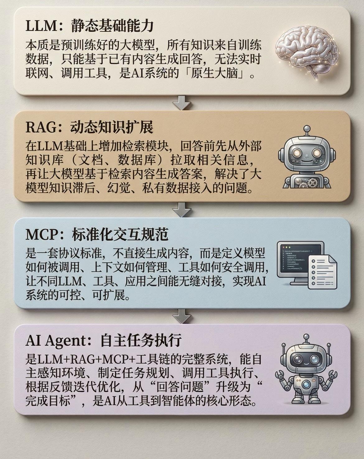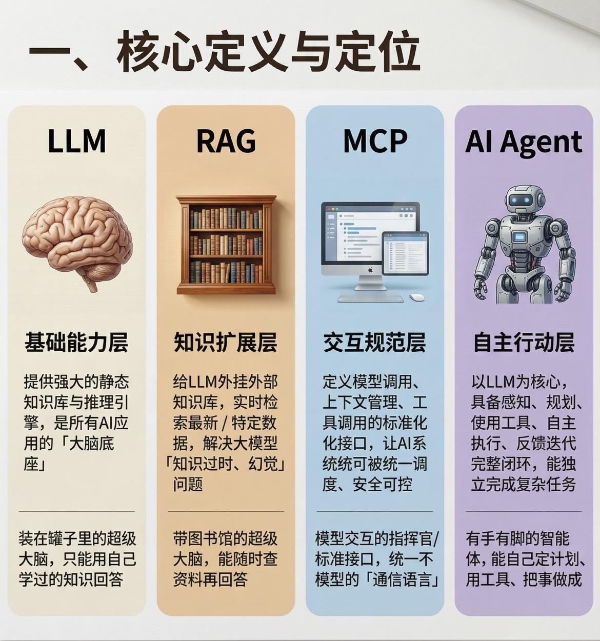 一张图弄懂LLM、RAG、MCP、AI Agent区别