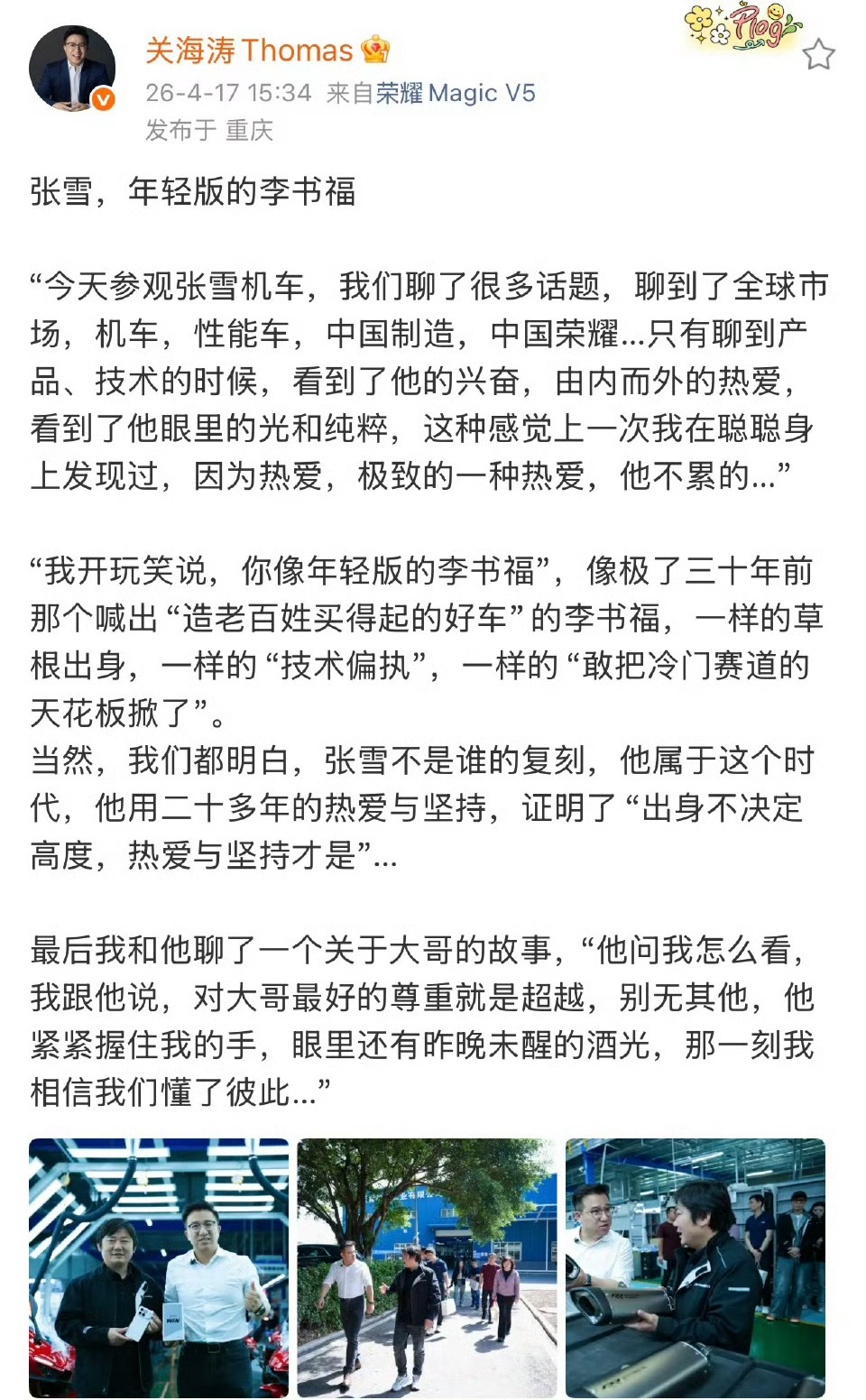 荣耀的高管去参观张雪机车,直言张雪就是年轻版的李书福,这评价含金量太高了吧!想想