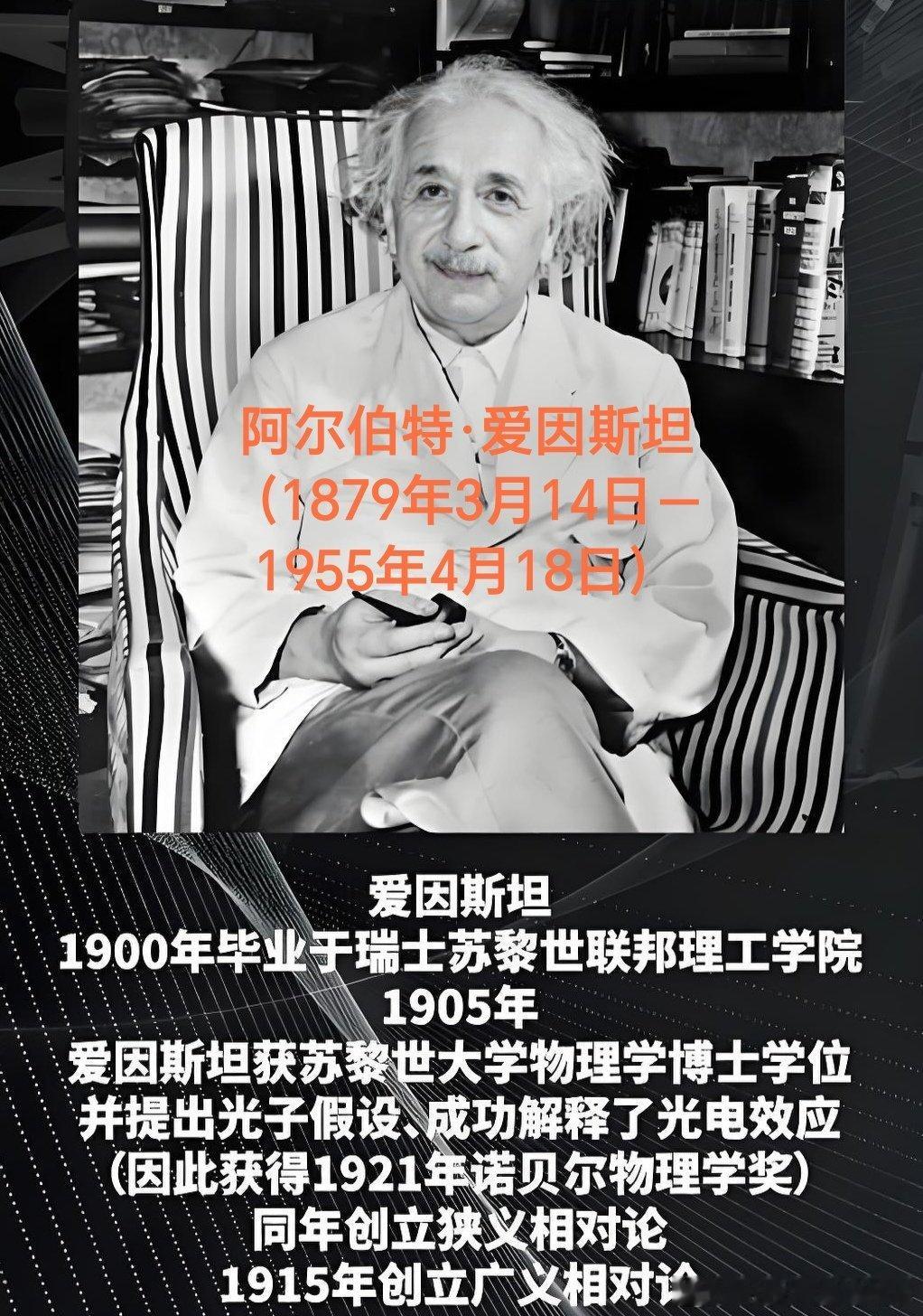 阿尔伯特·爱因斯坦(1879年3月14日-1955年4月18日),世界十大杰出物理学家之一,现代物理学的开创者、集大成者和奠基人。作为20世纪犹太裔理论物理学家,爱因斯坦创立了相对论-现代物理学的两大支柱之一(另一个是量子力学),其质能方程E=mc2著称于世,并因为“对理论物理的贡献,特别是发现了光电效应”而获得1921年诺贝尔物理学奖。1955年4月18日,爱因斯坦因病逝世。爱因斯坦一生成就卓越,其名字已成为“天才”的代名词。