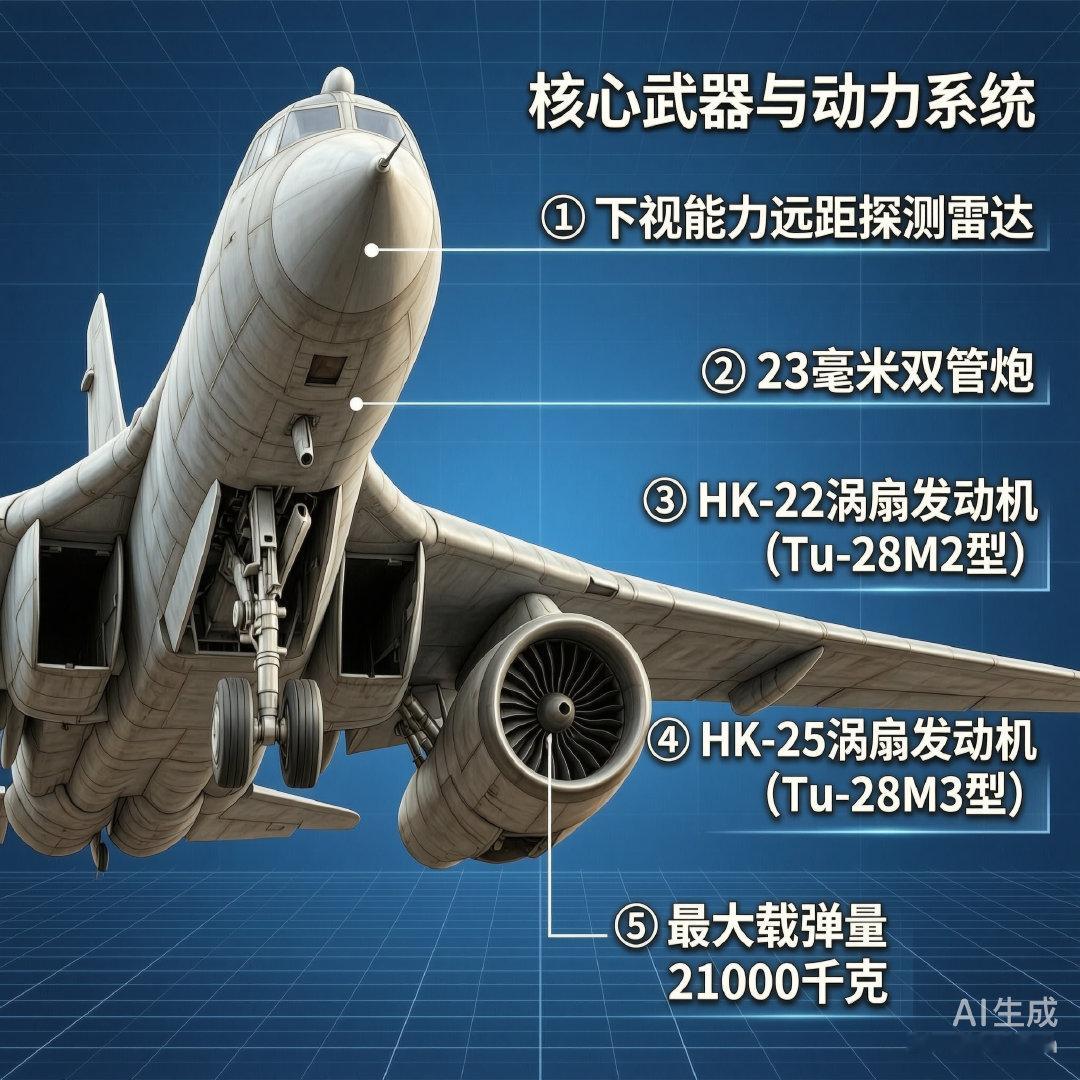 Tu-22M轰炸机装有1门23毫米双管炮,其机载设备较新,包括具有陆上和海上下视能力的远距探测雷达。该机的动力装置为2台并排安装的大推力发动机,其中Tu-22M2型使用的是HK-22涡扇发动机,Tu-22M3型则使用HK-25涡扇发动机。除机炮外,Tu-22M轰炸机还可挂载21000千克的炸弹和导弹。