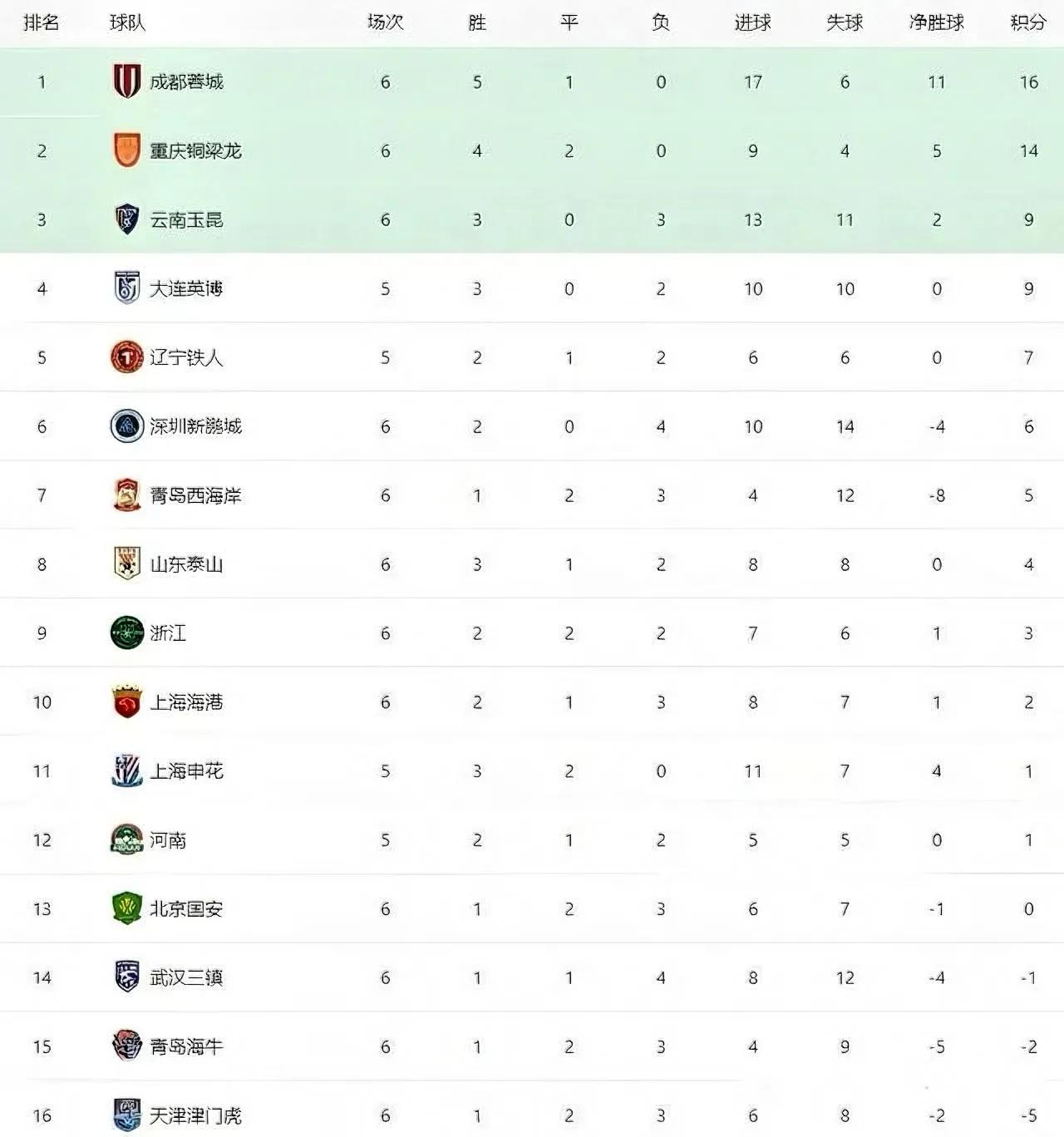 榜尾却是一片哀鸿。北京国安虽战平浙江,但6轮仅1胜,积分刚归零。更惨的是武汉三镇、青岛海牛和天津津门虎,因处罚深陷负分泥潭。津门虎虽取得赛季首胜,仍以-5分垫底。