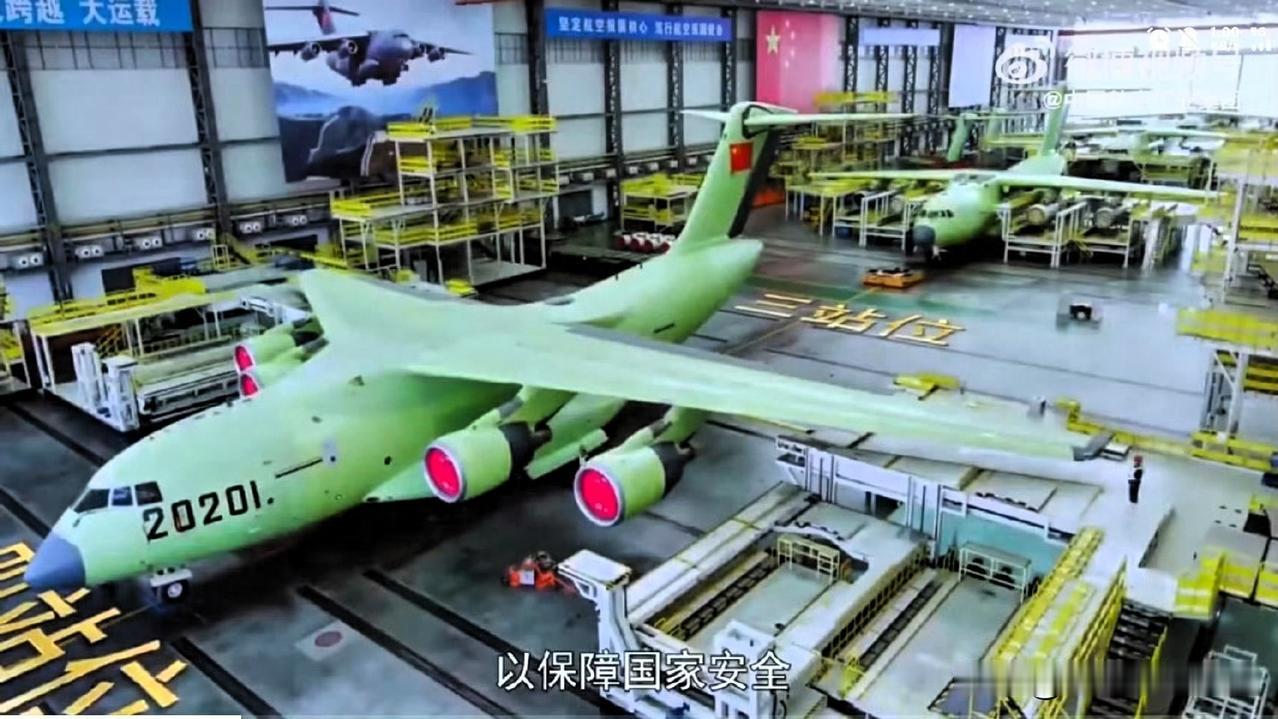 仔细看咱们这个运-20系列脉动生产线,画面里这四五架里面,首架是换装了大酒桶涡扇-20,编号为20201的运-20B,后面则是采用俄发D-30KP-2的运-20A了。