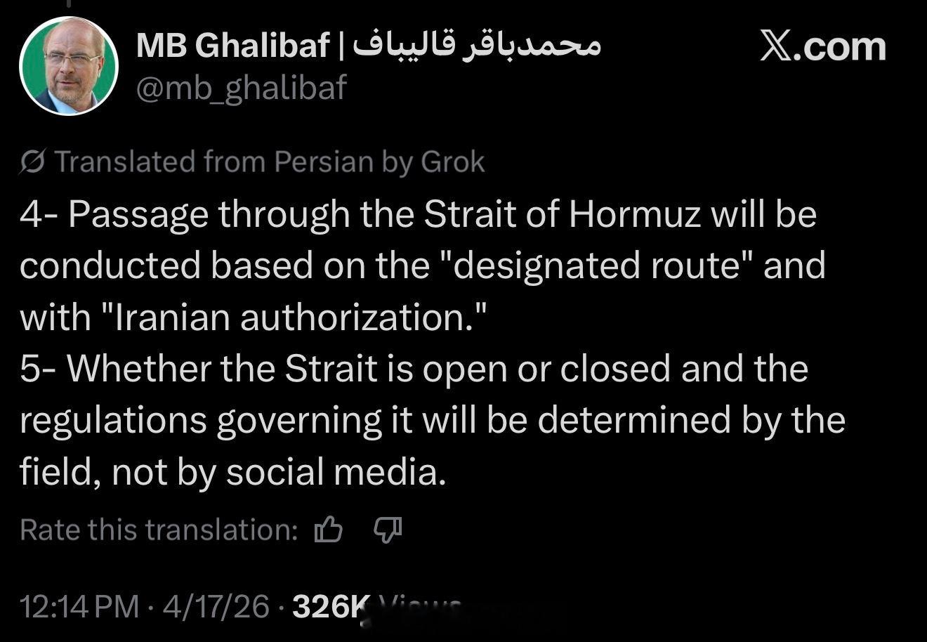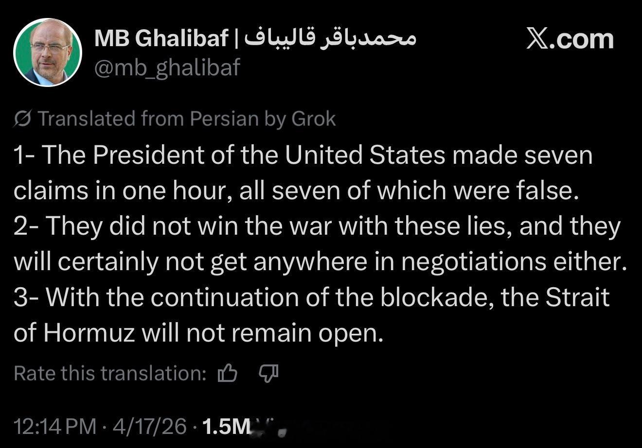 伊朗议会议长Ghalibaf发推文表示,川普今天的表述不实,并称只要美国军方的封锁持续存在,伊朗就将关闭霍尔木兹海峡: